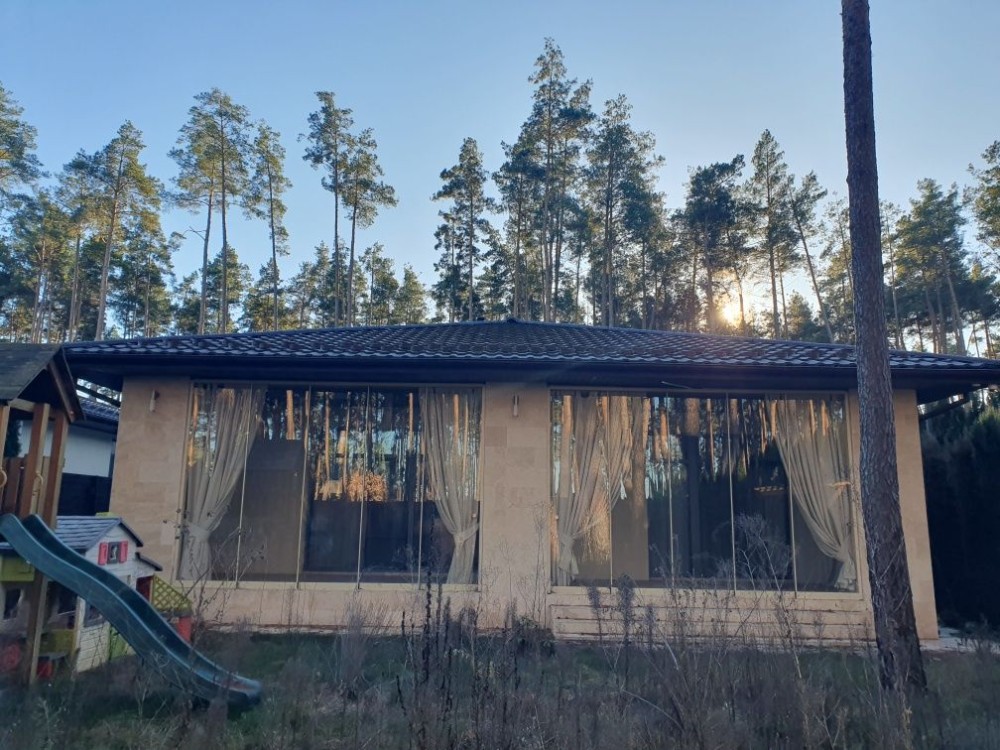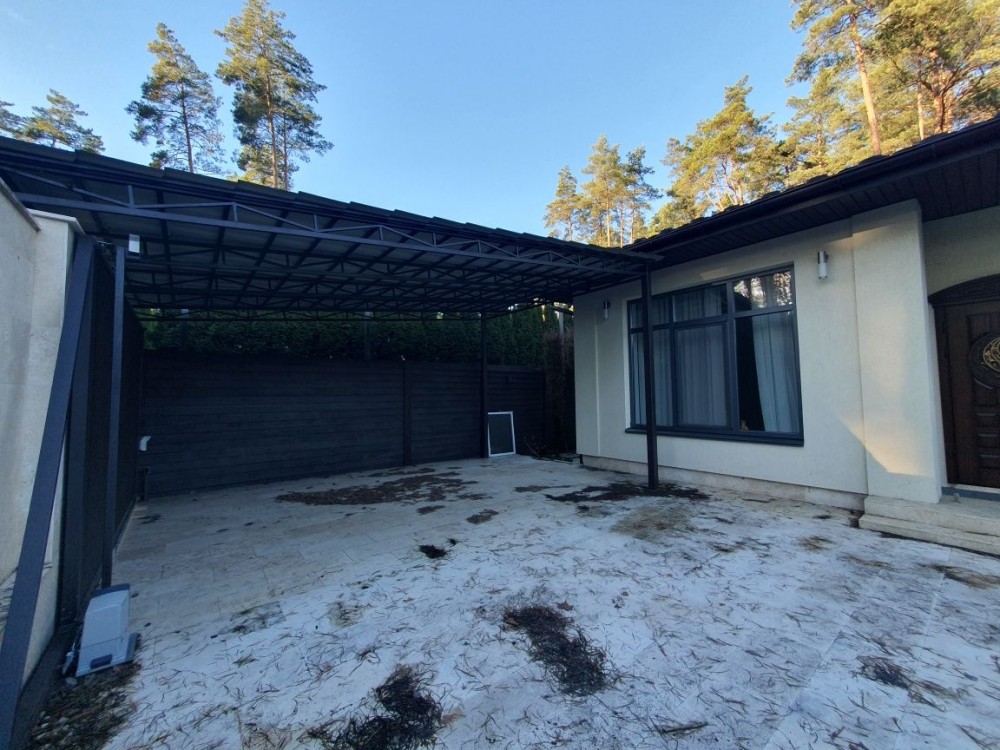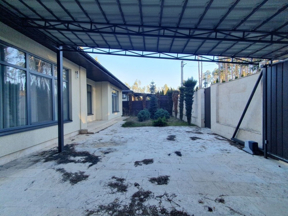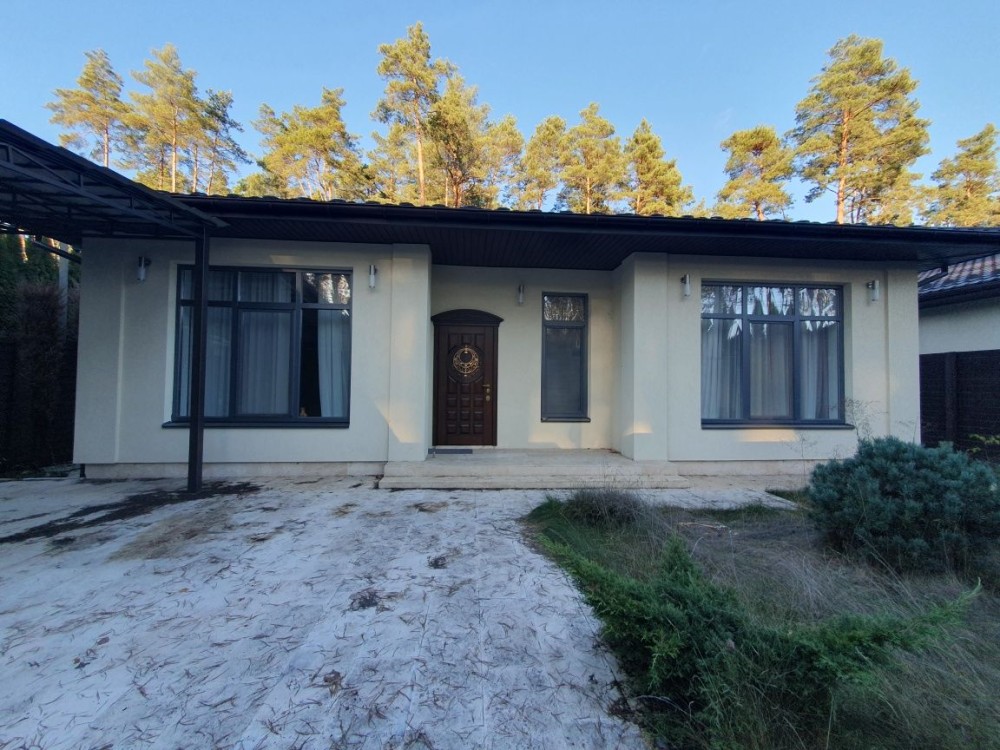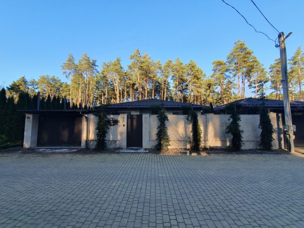 Одноповерхова якісний, сучасний котедж з ремонтом, площею 119 м.кв. + тераса 20 м2. Планування - продумана до дрібниць: простора кухня -їдальня з виходом на терасу, де відкривається вид на ліс, 3 - світлих спальні, 2 санвузли, гардеробна, топочна. Подача води - із власної свердловини, каналізація-септик. Ділянка 7.5 соток із впорядкованою територією та ландшафтним дизайном, декоративні види хвойних рослин, автоматичний полив, зовнішнє освітлення. Вітражні вікна з енергозберігаючими склопакетами та якісною фурнітурою. Будинок знаходиться в районі нових котеджів, що потопають у зелені та красі високих струнких сосен. Місце – шикарне! Асфальтований під'їзд., По всьому периметру ділянка огороджена парканом з автоматичними воротами, автонавіс, місце під кілька авто.