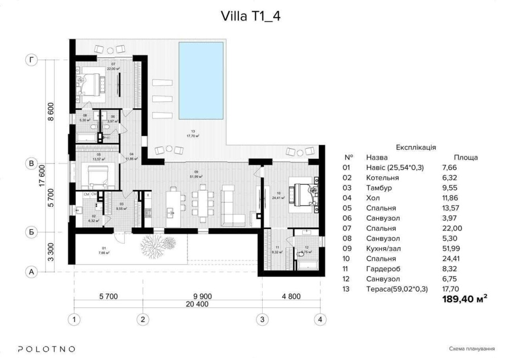 Villa 189,4 м² — це комфортний будинок із великою кухнею-вітальнею, просторою терасою та продуманою приватною зоною для життя.