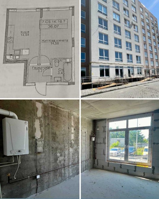 Загальна площа 35м2, кухня 14,6м2, кімната 14.5м2.