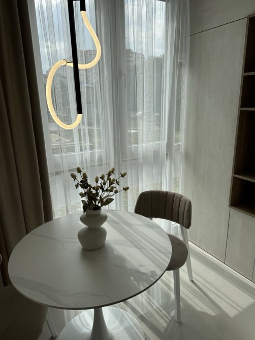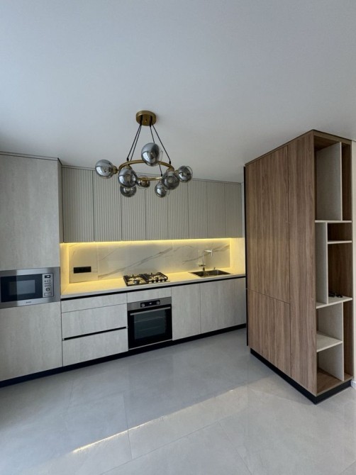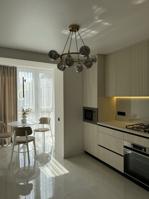 Облаштована необхідними меблями та технікою (кондиціонер, пральна машинка, холодильник, телевізор, газова плита, духова шафа, витяжка, мікрохвильова ni).