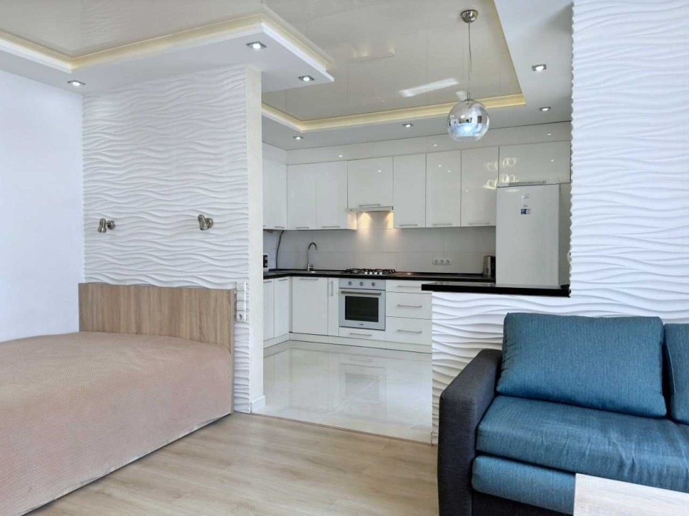 Дуже світла, сонячна та затишна квартира. Індивідуальне опалення, встановлений підігрів підлоги. Велика кухня. Кімната зонована: є зона відпочинку з розкладним диваном та телевізором, а також окрема зона з великим двоспальним ліжком. Санвузол суміжний, з ванною.