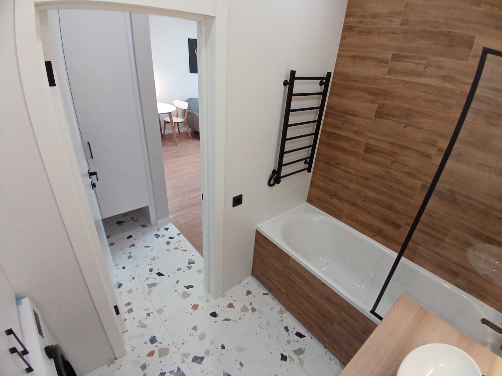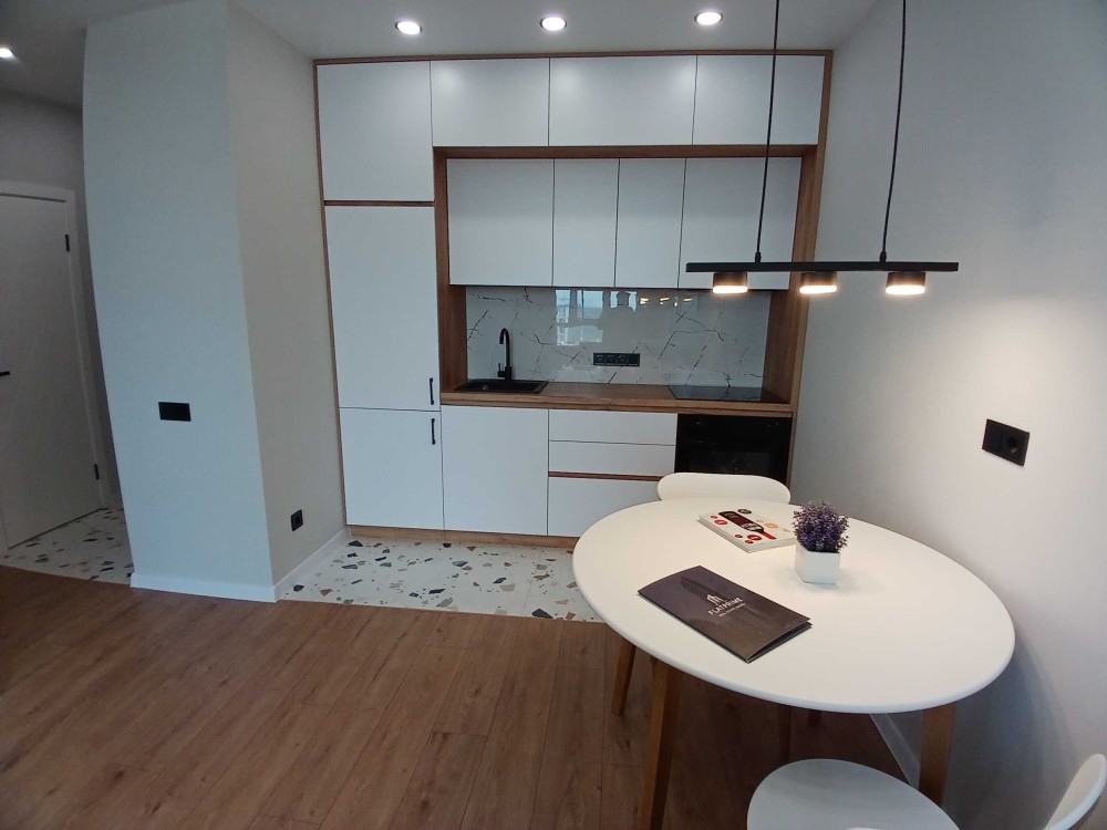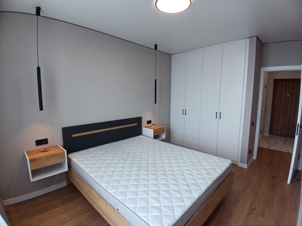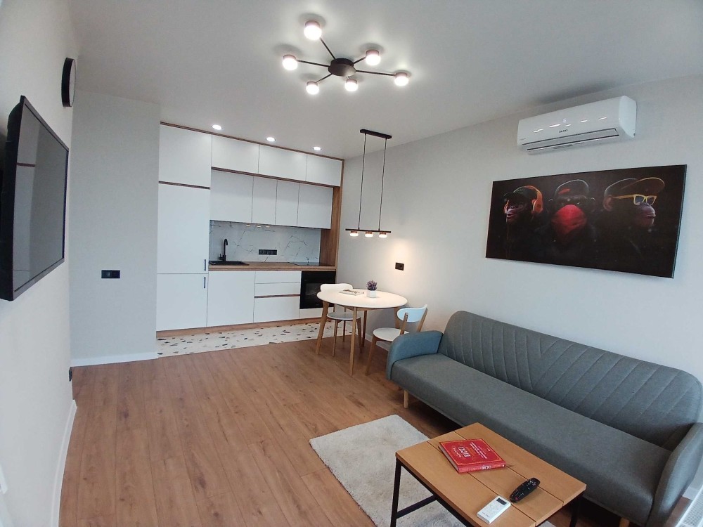 Квартира повністю оснащена для комфортного проживання: у спальні ліжко та шафа, у кухні-вітальні розкладний диван, телевізор, кондиціонер, а також кухня з індукційною варильною поверхнею, духовкою та холодильником. Санвузол суміщений, обладнаний бойлером для гарячої води. По всій квартирі встановлена тепла підлога.