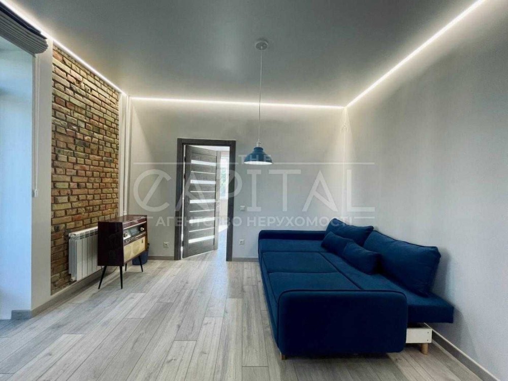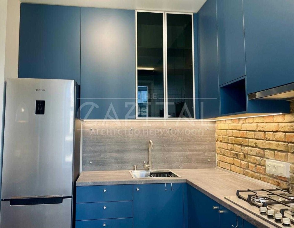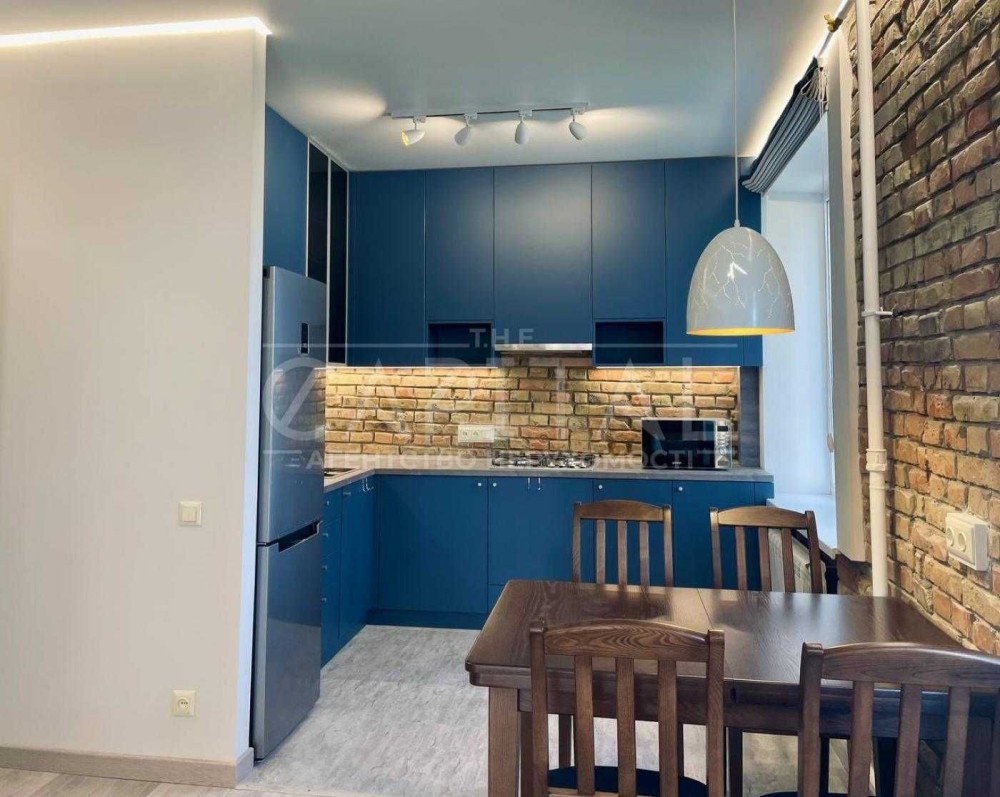 Пропонується простора та сучасна квартира з унікальним інтер’єром у стилі лофт. Поєднання темно-синіх відтінків, натурального дерева та цегляних елементів створює стильну й затишну атмосферу для комфортного життя.