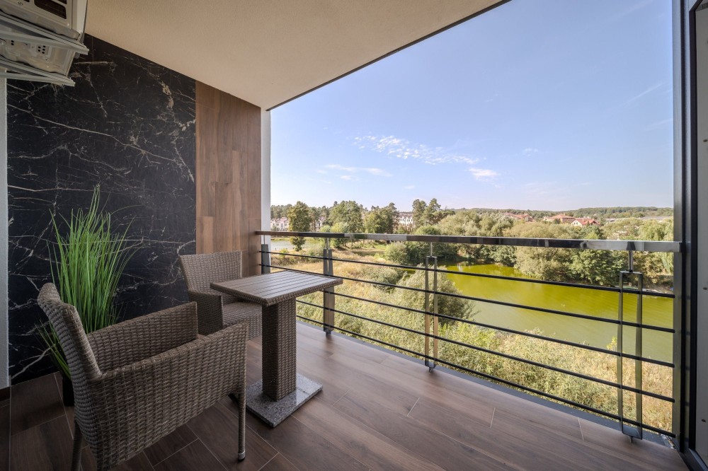 Простора тераса з виглядом на озеро.