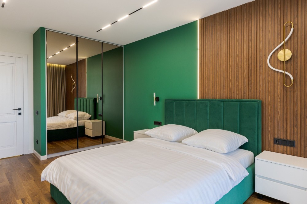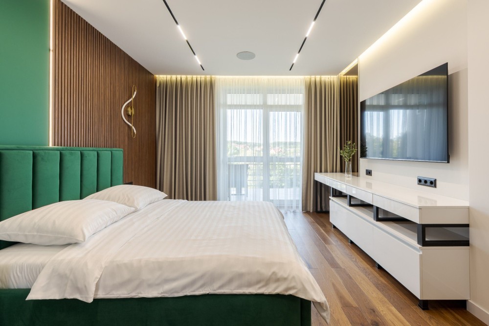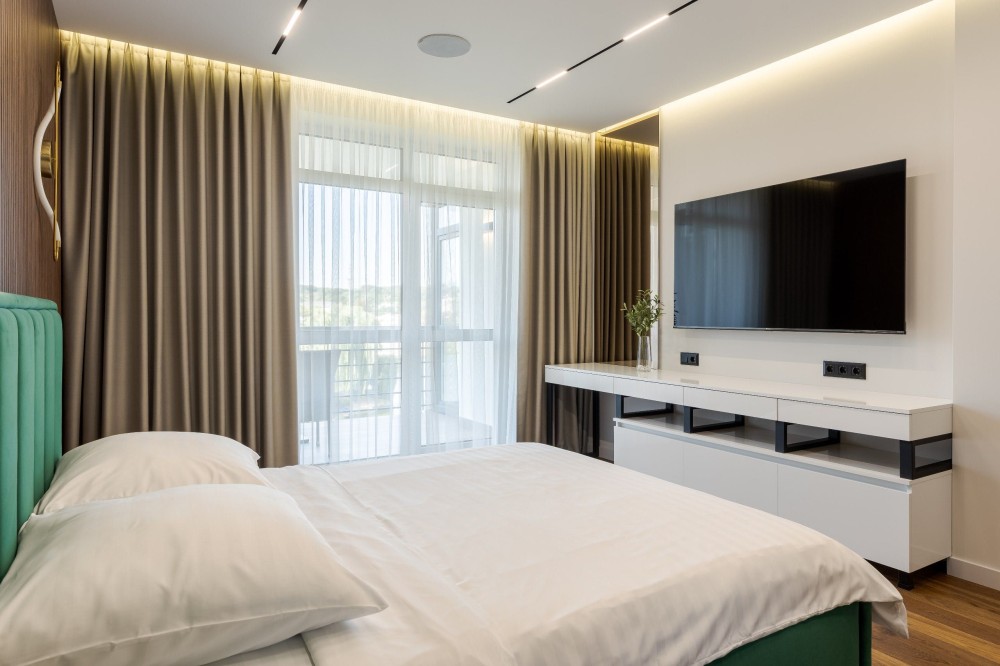 Спальня - двоспальне ліжко, шафа-купе, плазма, робоче місце.