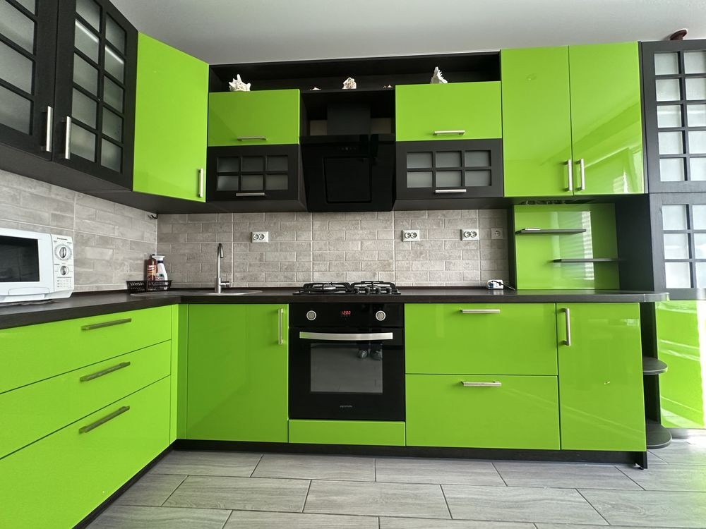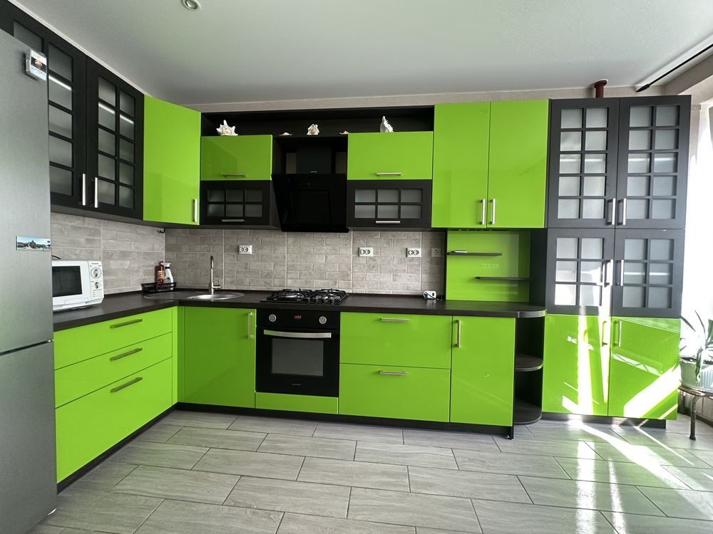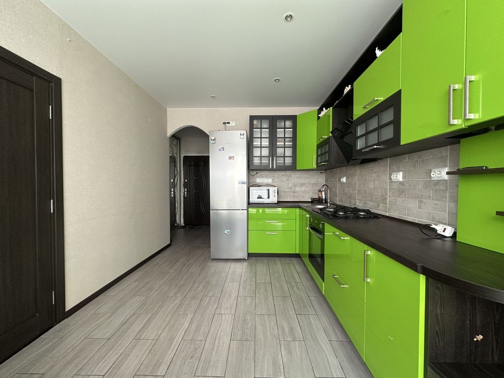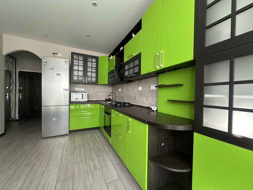 Квартира укомплектована меблями та побутовою технікою: холодильник, газова варильна поверхня, духова шафа, мікрохвильова піч, витяжка, пральна машина.