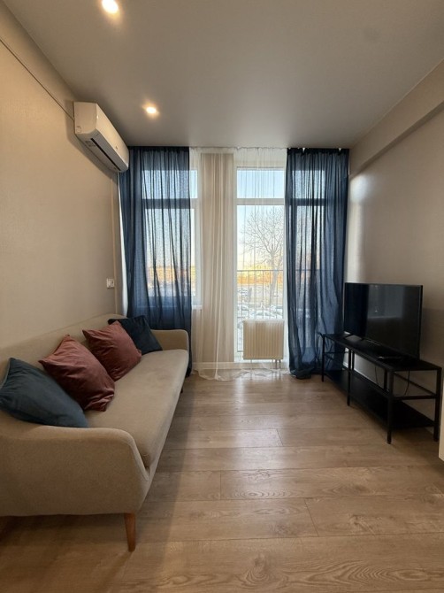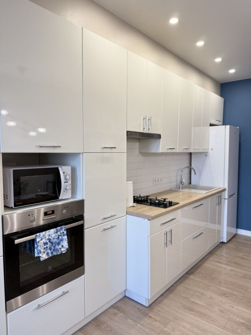 Кухня-вітальня та спальна кімната. Шафа купе в передпокої 2,70 м, шафа купе в спальні 1,5 м, двоспальне ліжко з відсіком для зберігання, диван на кухні, пральна машина. Газова поверхня, духовка, мікрохвильова піч, холодильник, чайник, витяжка, домофон, сантехніка grohe, телевізор за запитом, два кондиціонери.