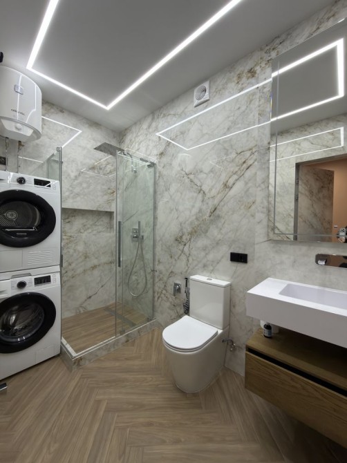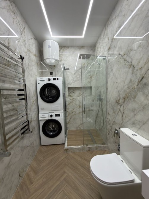 Кухня укомплектована повністю: посудомийна машина, мікрохвильова піч, кавомашина, електрочайник. Також у квартирі є пральна машина, сушильна машина, пилосос та праска.