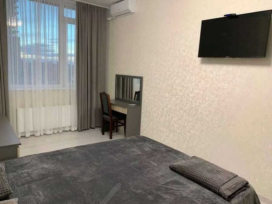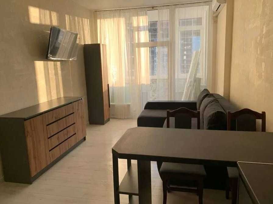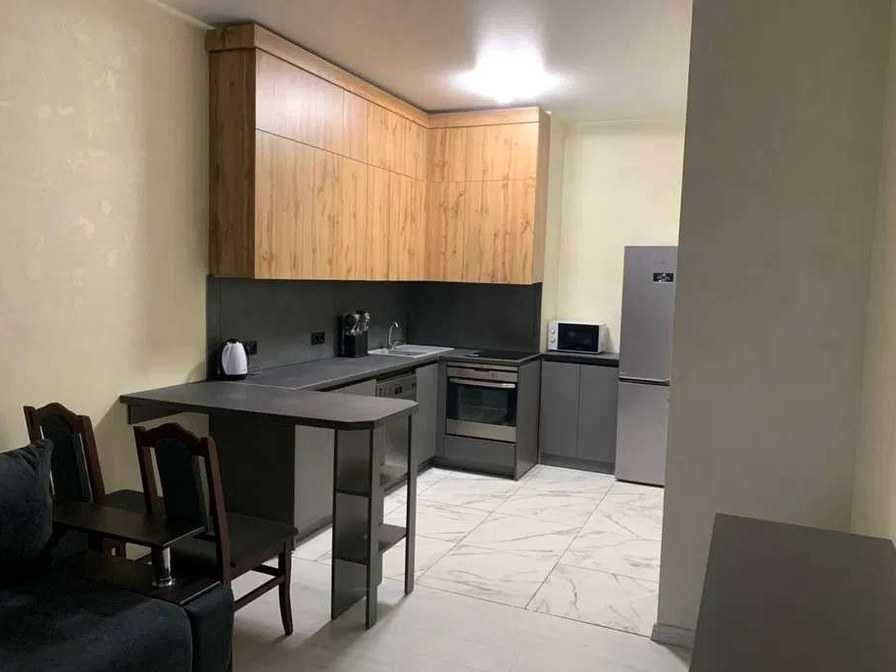 Перша здача. Планування: окрема спальня, кухня-студія з лоджією, суміщений санвузол. Повністю мебльована, укомплектована всією необхідною технікою: бойлер, пральна та сушильна машини, посудомийна машина, мікрохвильова піч, чайник, духова шафа, індукційна варильна поверхня, утюг, пилосос, кондиціонери в кожному приміщенні. Є необхідний посуд. Встановлені індивідуальні лічильники на воду, опалення та електроенергію. Під час відключень електроенергії функціонують опалення, вода та ліфти. У будинку 5 ліфтів, на 5 поверсі — тераса з дитячим і спортивним майданчиком. На території — кафе, салон краси, продуктовий магазин, квітковий, відділення Нової пошти, фітнес-студія. Є паркінг.
