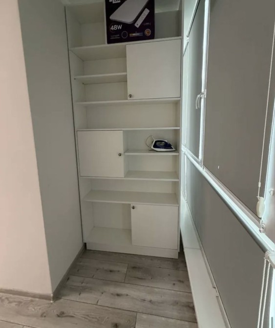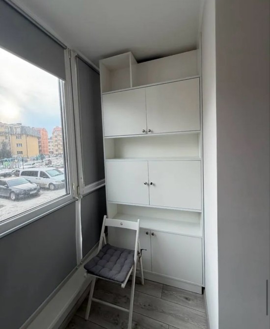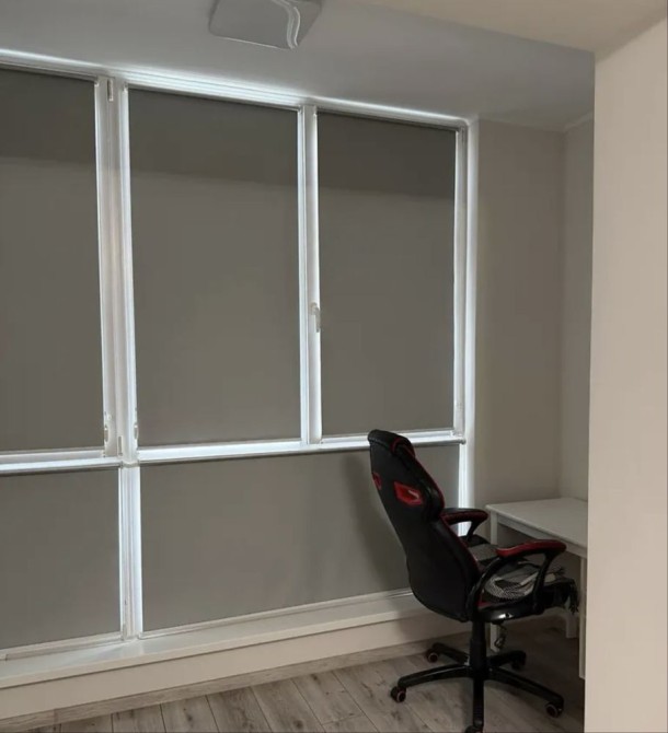 На лоджії облаштовано два повноцінні робочі місця зі столами та комфортними стільцями. Встановлені якісні ролети, які повністю закривають сонячне світло, що ідеально підходить для роботи з дому або навчання.