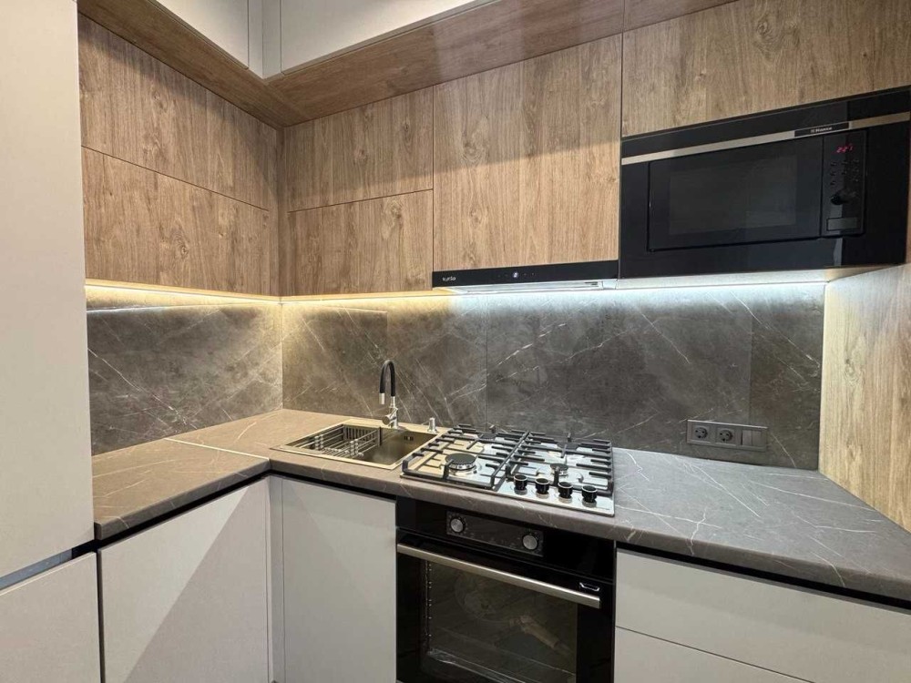 Квартира має простору кухню з гарним кухонним гарнітуром, зоною відпочинку з диванчиком та повноцінною обідньою зоною ідеальне місце як для щоденного життя, так і