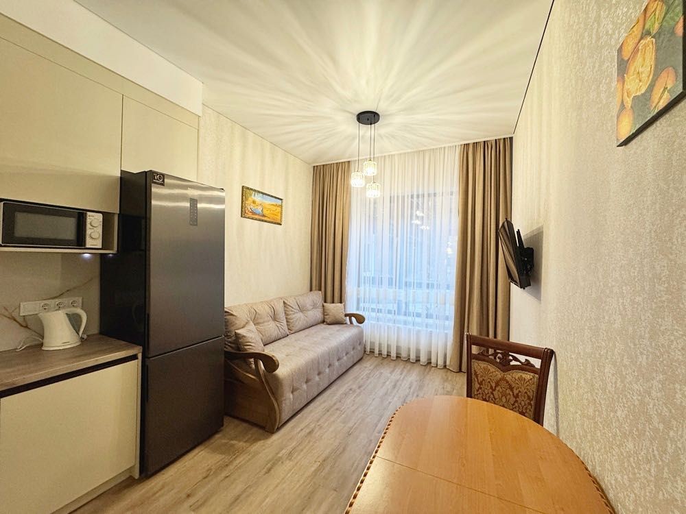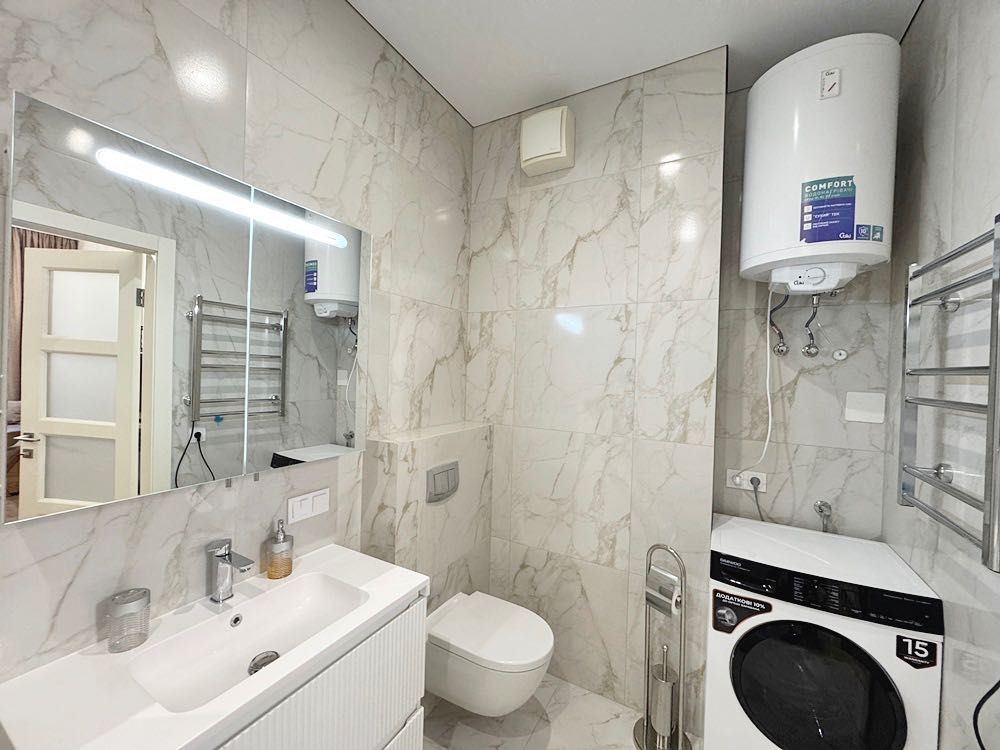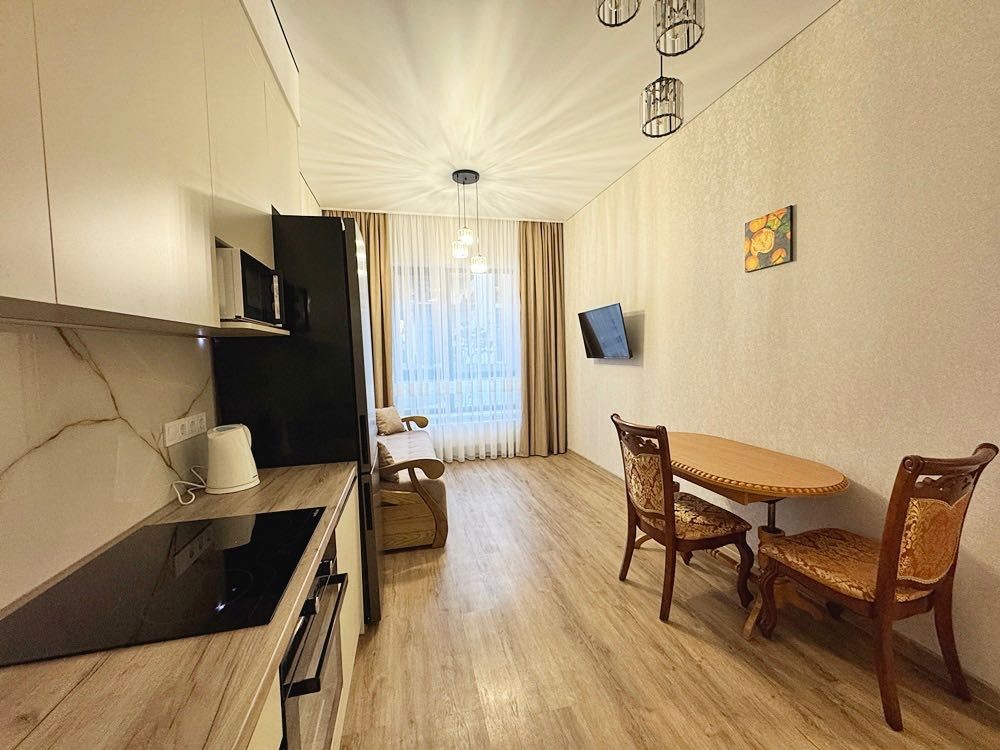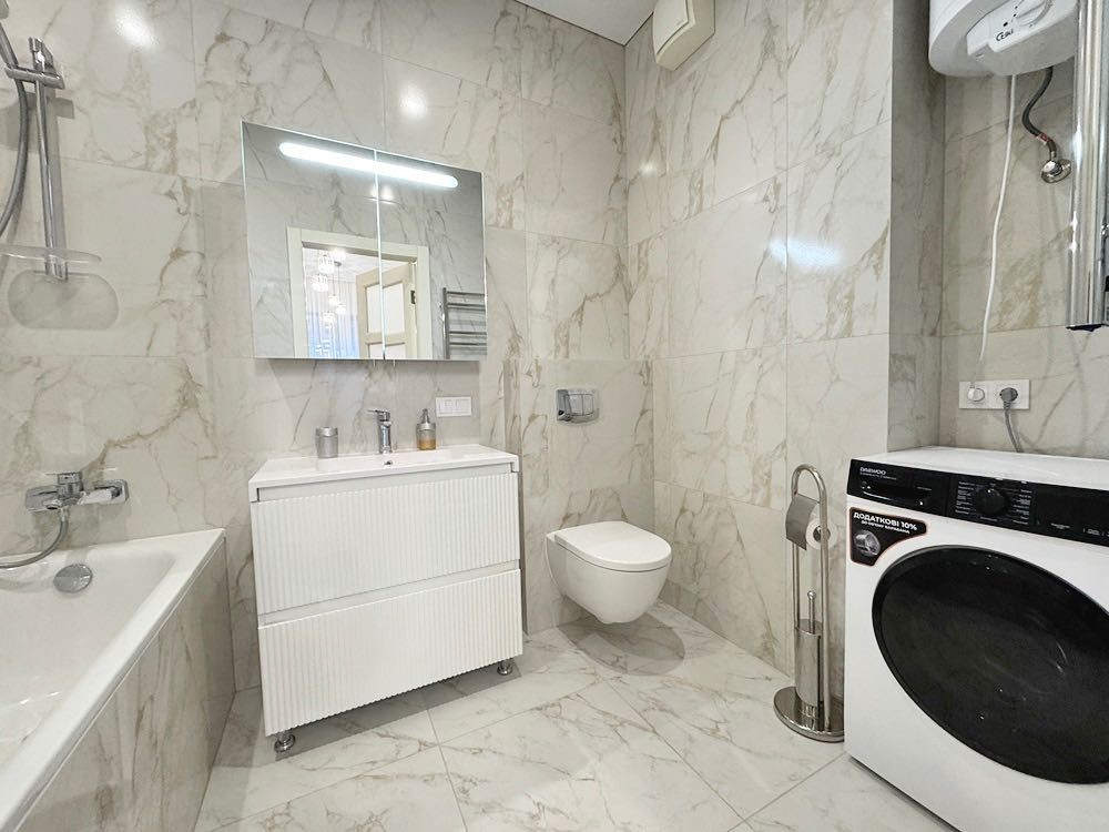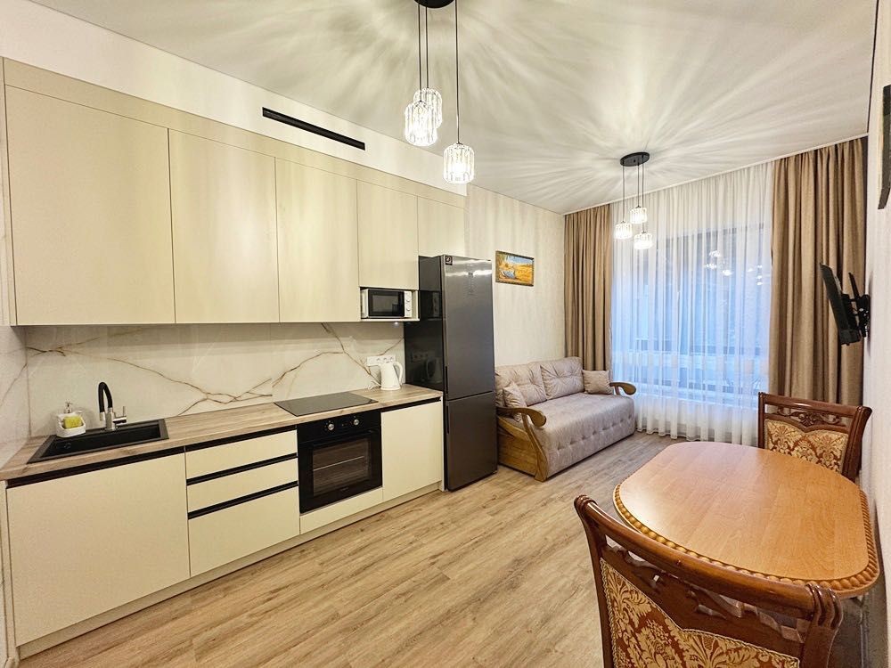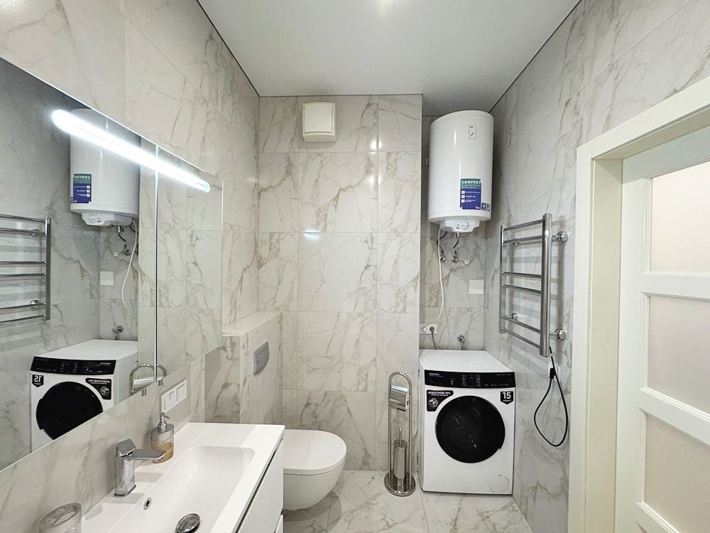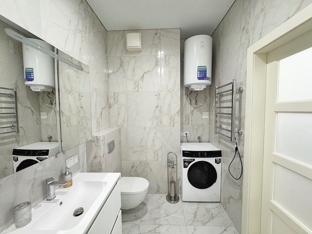 Квартира укомплектована всім необхідним для проживання — ліжко з матрацом, приліжкові тумби, диван, телевізор, обідній стіл зі стільцями. Підлога виконана з якісного ламінату, тепла підлога встановлена в кухонній зоні та санвузлі.