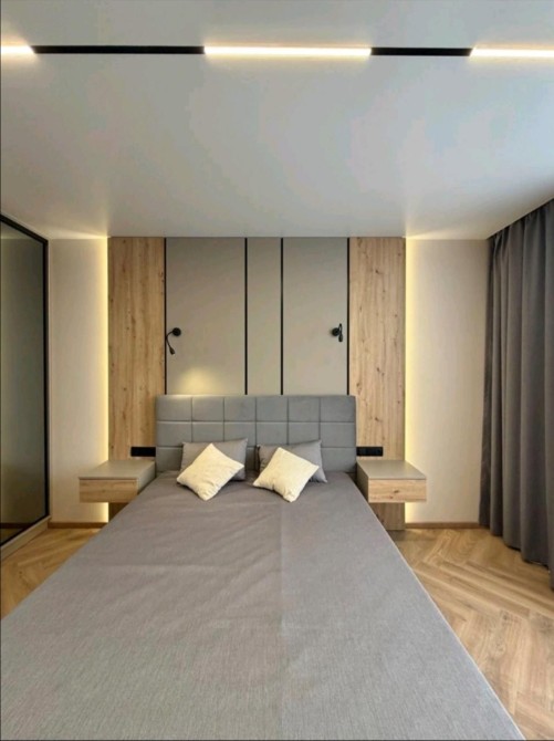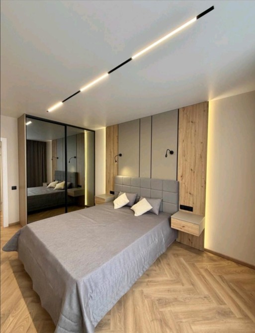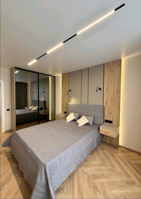 В спальній кімнаті велика шафа гардероб та ліжко з підйом механізмом.