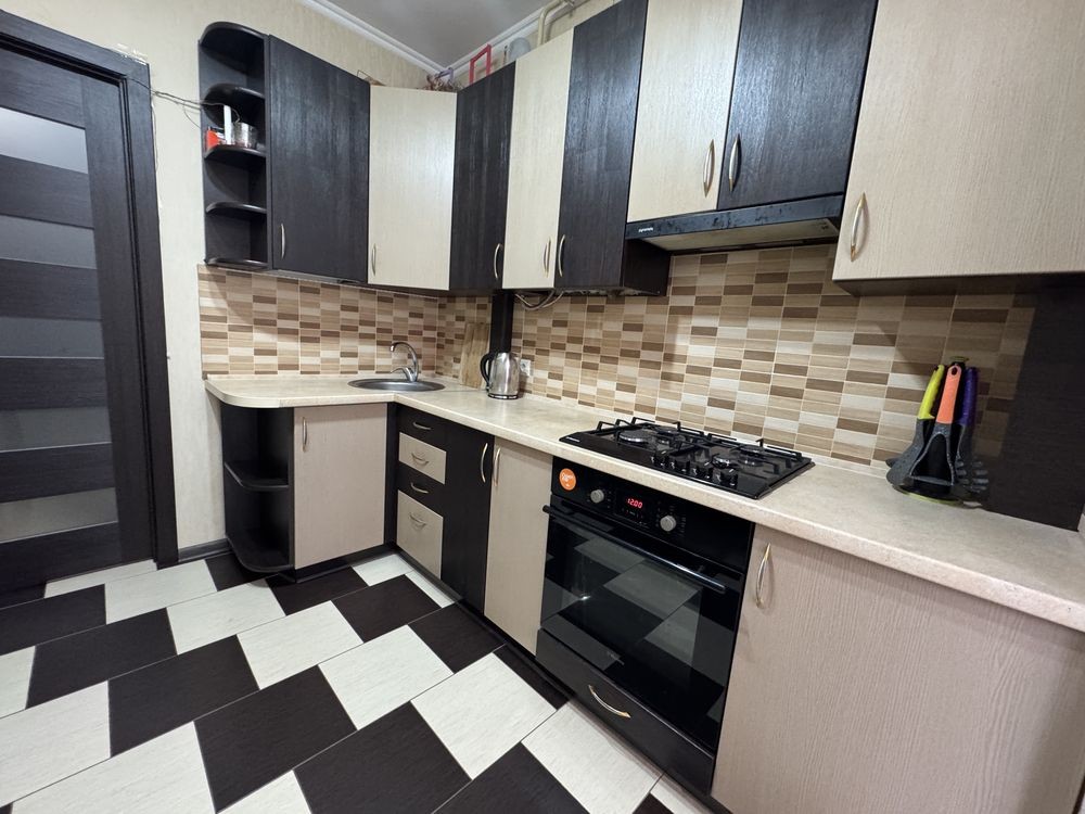 Простора кухня з лоджією наповнена світлом та обладнана всім необхідним для щоденного користування: холодильником, духовою піччю, зручною робочою зоною та обіднім столом. У окремій кімнаті розміщено : розкладний диван , телевізор, робоча зона та містка шафа-купе, що забезпечує достатньо місця для зберігання речей.