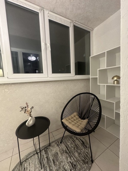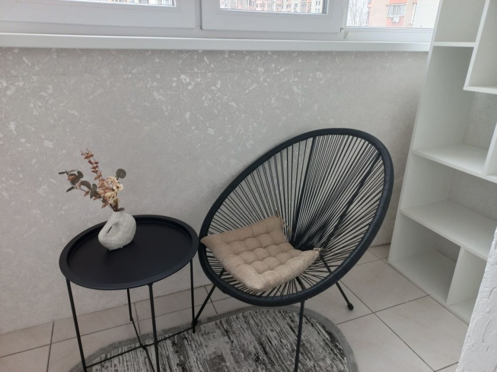 Обладнана лоджія з столиком та кріслом.