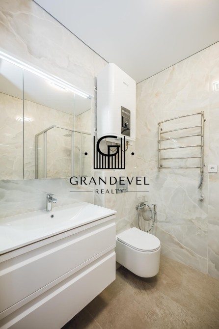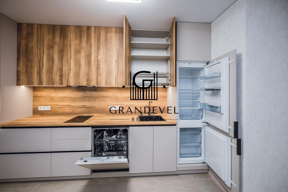 Квартира повністю укомплектована новими меблями та технікою: великий диван, вбудована кухня, варильна поверхня, духова шафа, холодильник, кондиціонер, бойлер, пральна та посудомийна машини.