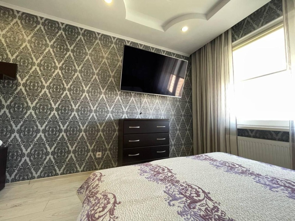- велика світла зонована спальна кімната зі двоспальним ліжком, розкладним диваном, телевізором, кондиціонером