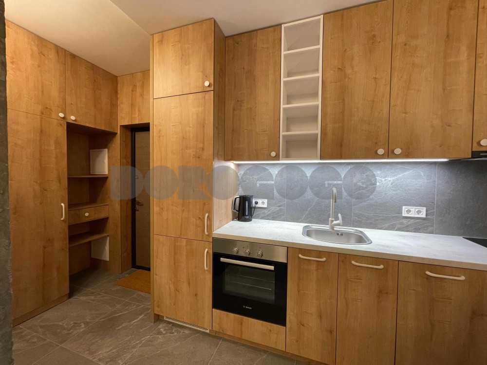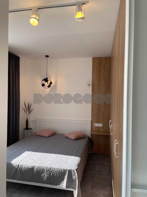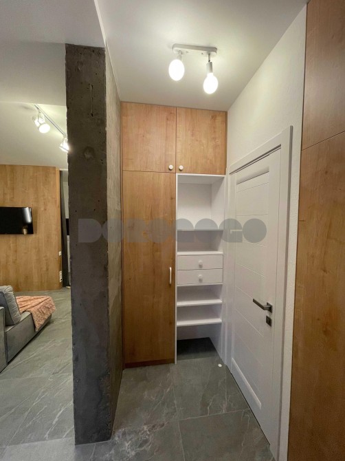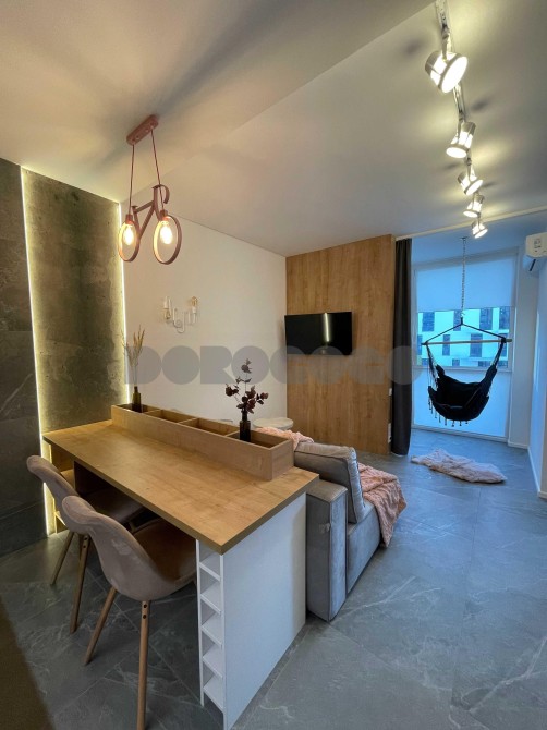 Окрема спальня з двоспальним ліжком та місткою шафою. Вітальня поєднана з кухнею, обладнана всією необхідною технікою європейських брендів для комфортного проживання. Є окрема робоча зона. Коридор з великою шафою для зберігання речей. Планування максимально продумане, розумно використаний кожен квадратний метр.