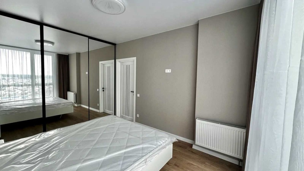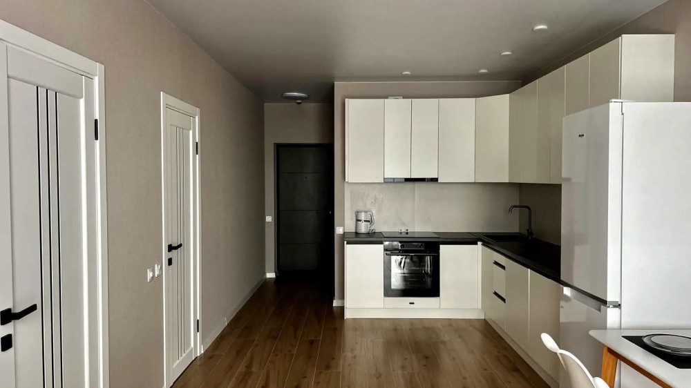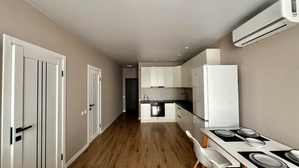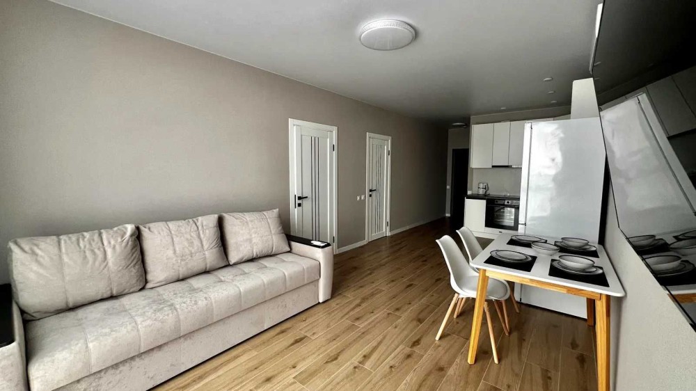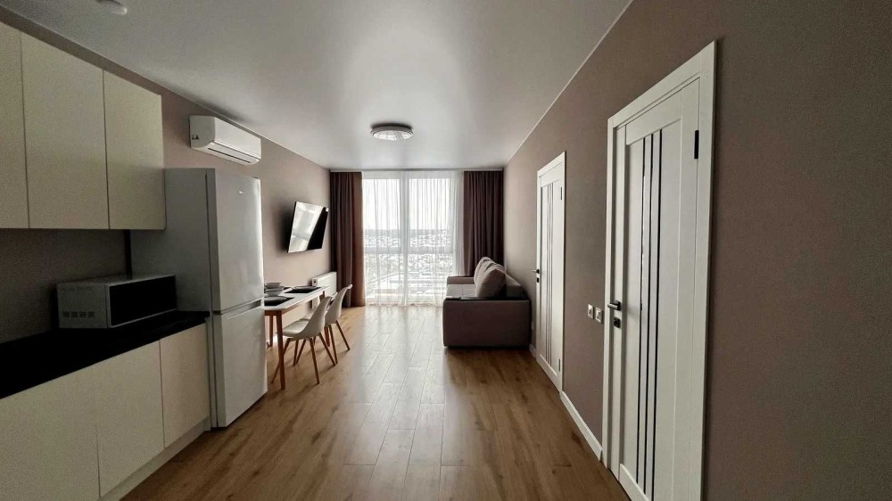 Виконаний стильний ремонт у світлих тонах. Зручне планування: велика кухня-студія з зоною відпочинку та окрема спальня з двоспальним ліжком і місткою шафою. Є просторий коридор із вбудованими шафами.