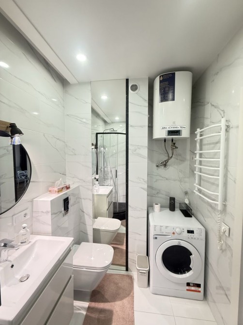 Квартира укомплектована технікою: прально-сушильна машина, посудомийна машина, бойлер, варильна поверхня, витяжка, мікрохвильовка, 2 кондиціонера, 2 телевізора, осмос ( фільтр для води)