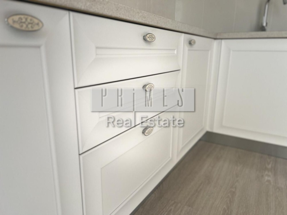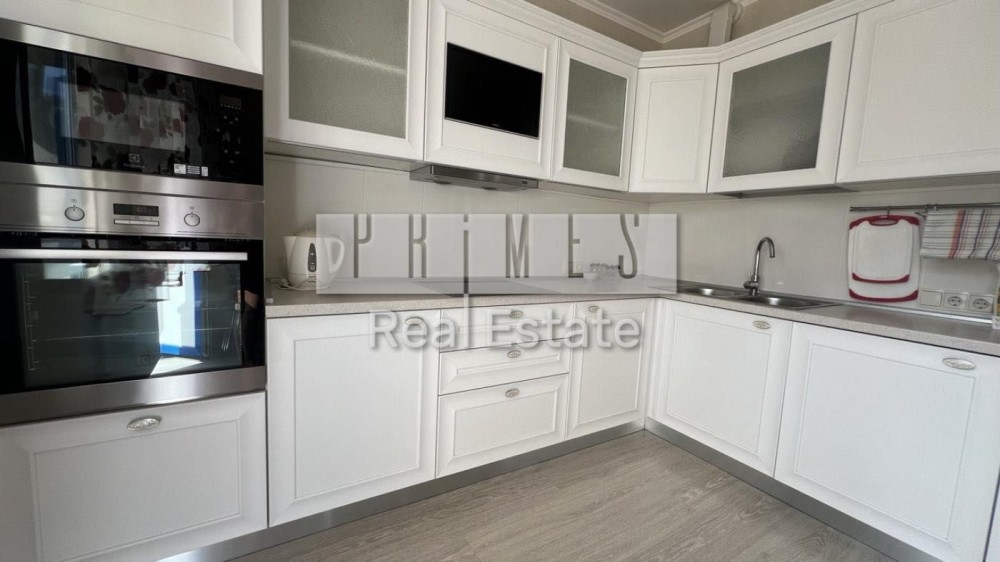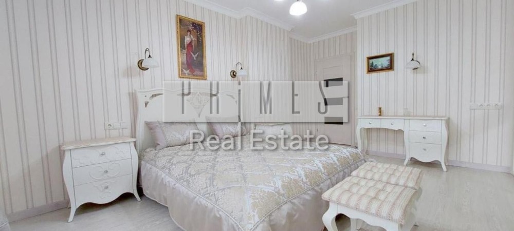 Затишна та елегантна спальня: двоспальне ліжко з банкеткою; витончений комод із зеркалом; шафа для одягу. Компактні рішення на білій кухні: стіл-трансформер, вбудована техніка.