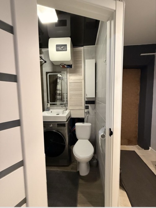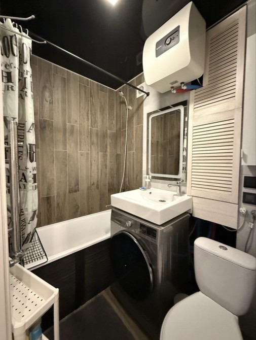 Санвузол з повноцінною ванною, встановлений електричний бойлер та прально-сушильна машина — зручно й без зайвих турбот (економія місця на сушці).