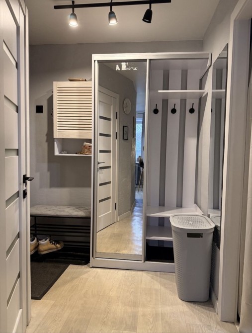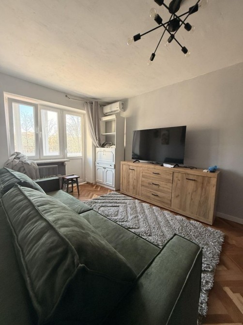 Квартира площею 43 м² продумана й простора. Велика світла вітальня може слугувати прохідною спальнею: тут є великий телевізор, кондиціонер та зручний розкладний диван для відпочинку або сну.