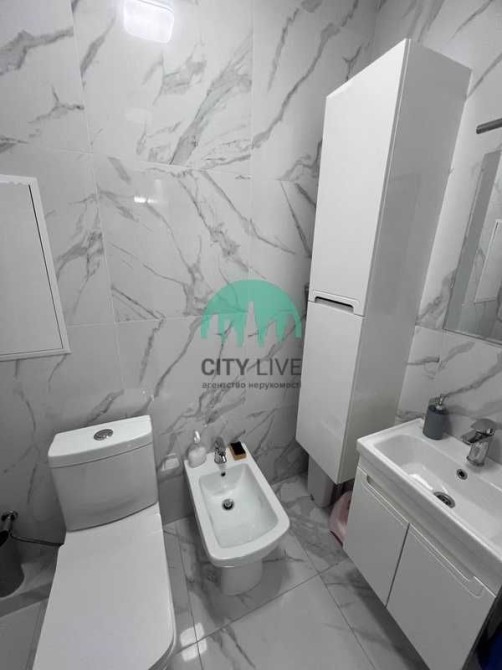 Санвузол роздільний, оздоблений сучасною плиткою під мармур. У ванній кімнаті встановлена душова кабіна, сушарка для рушників та пральна машина. Також є окреме приміщення з туалетом та біде.