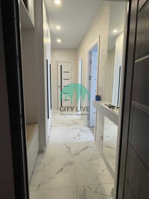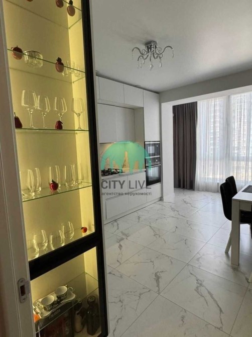 Інтер'єр виконаний у світлих тонах, що створює відчуття простору та затишку. Особливістю квартири є панорамні вікна та багаторівневе освітлення.