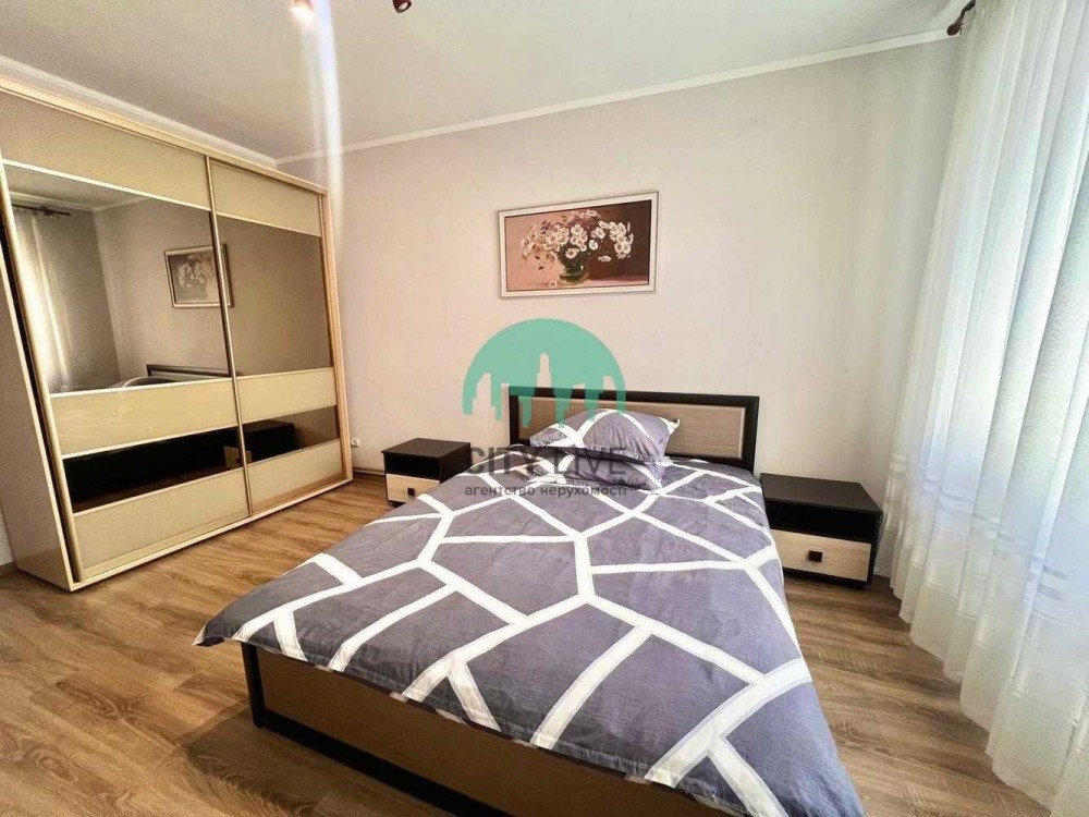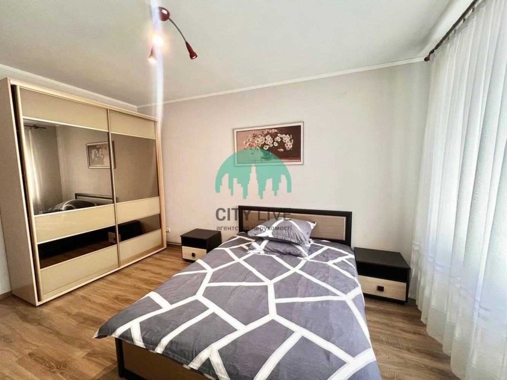 • Спальня: Двоспальне ліжко з тумбами, містка шафа-купе з дзеркальними вставками.