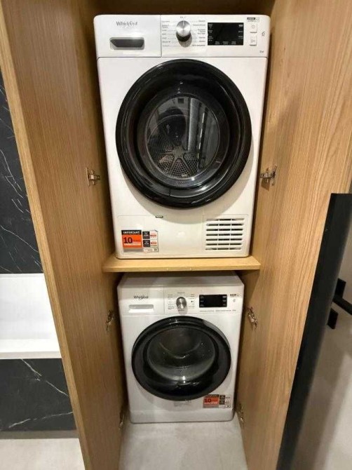 Зручна ванна з рукомийником, інсталяцією, рушникосушкою, є пральна та сушильна машини