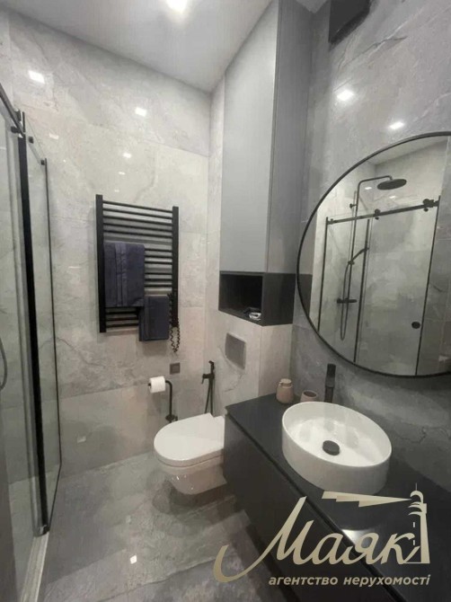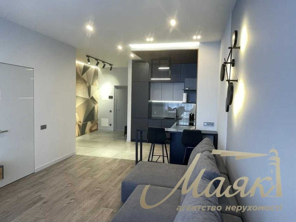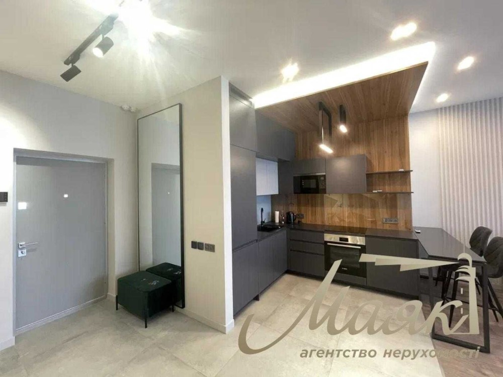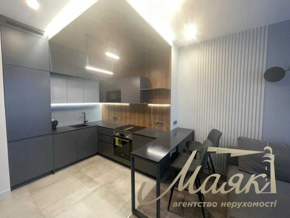 Квартира виконана в сучасному стилі, з використанням преміальних матеріалів та техніки провідних брендів AEG, Bosch, Samsung.