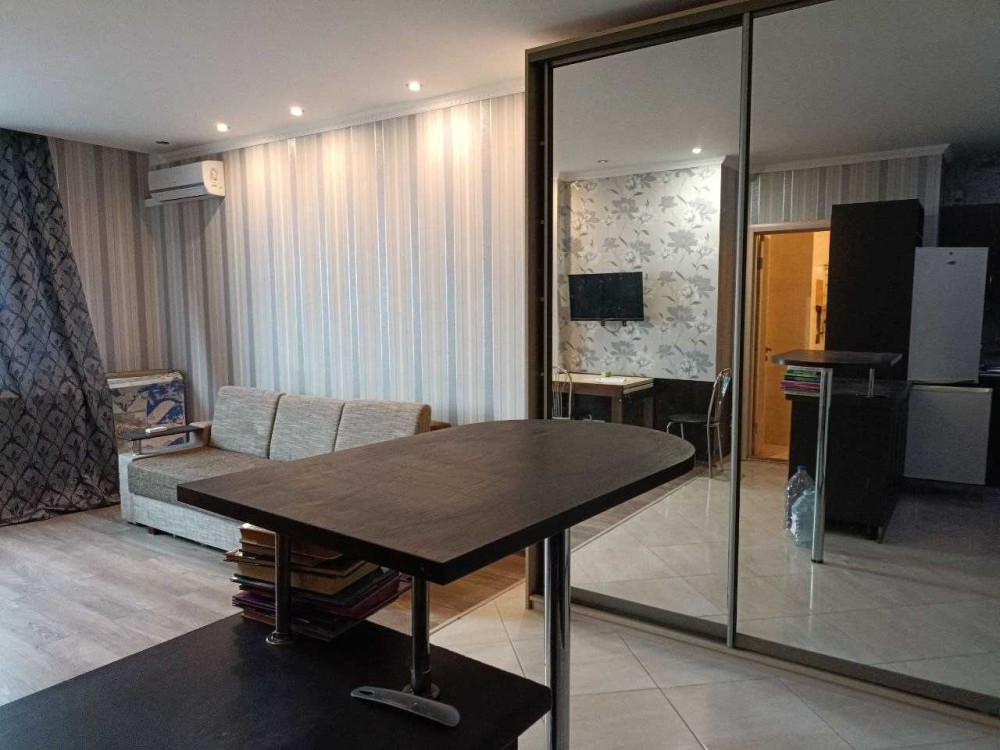 Квартира з роздільним плануванням. Спальня та велика вітальня з кухнею. Також є невеликий балкон. Є вся необхідна побутова техніка телевізор, холодильник, кондиционер, пральна машина, праска, чайник. Лічильники гаряча, холодна вода, електроенергія.