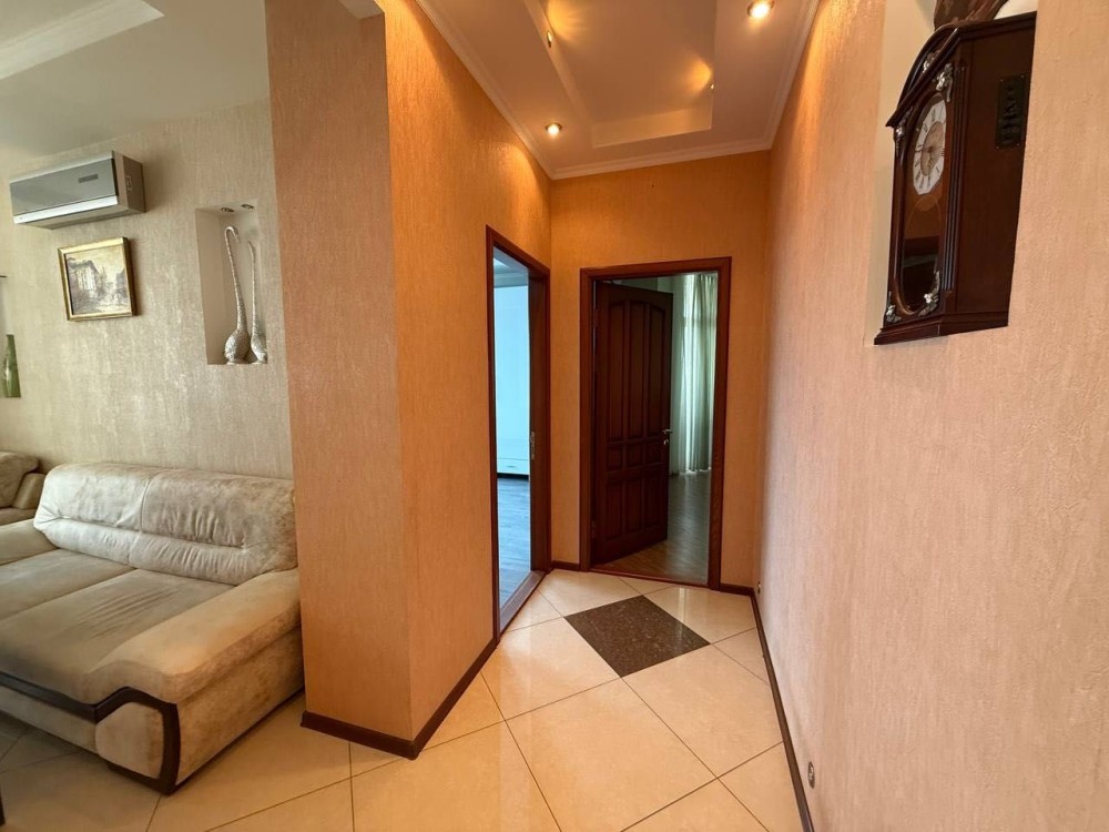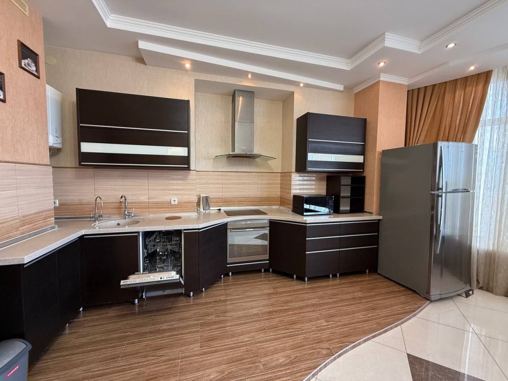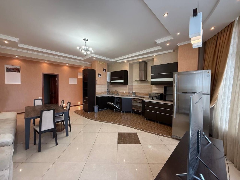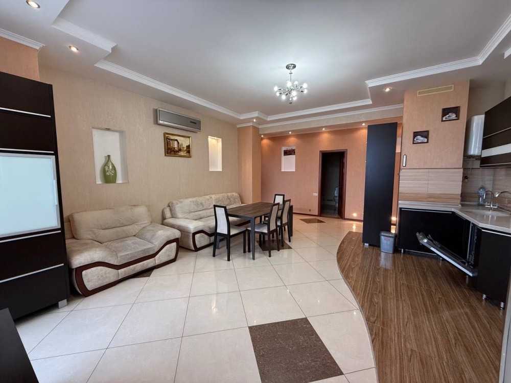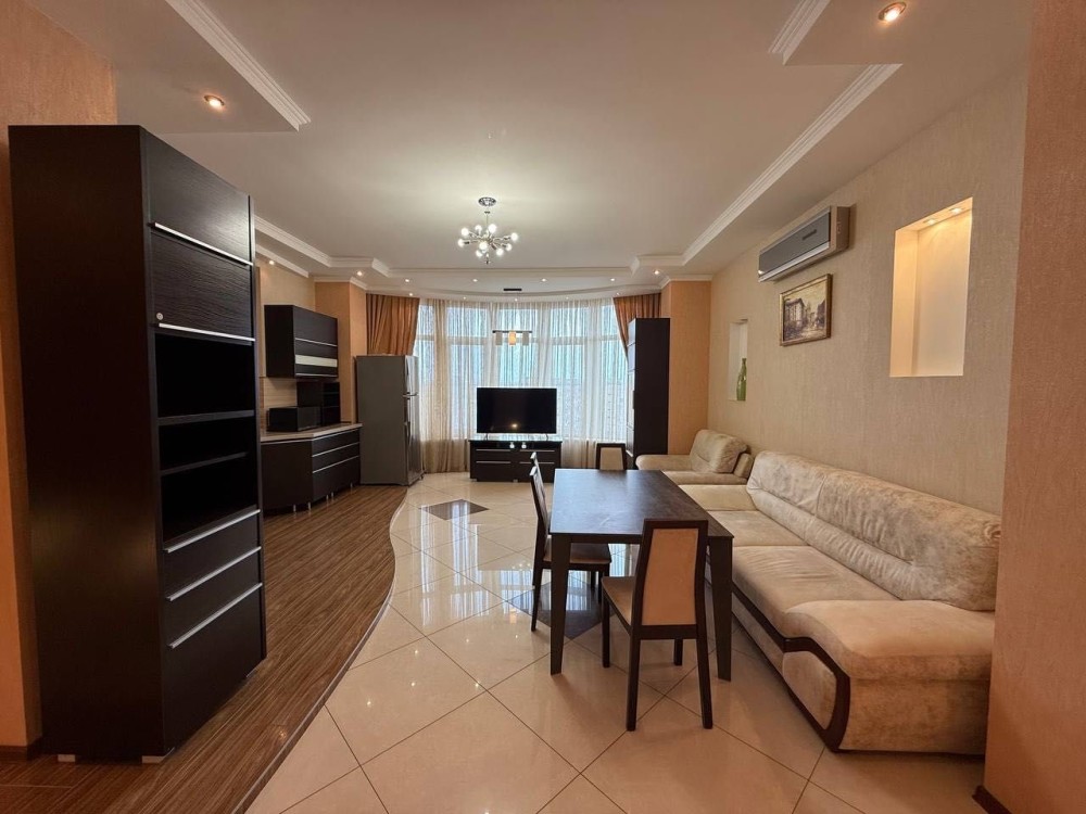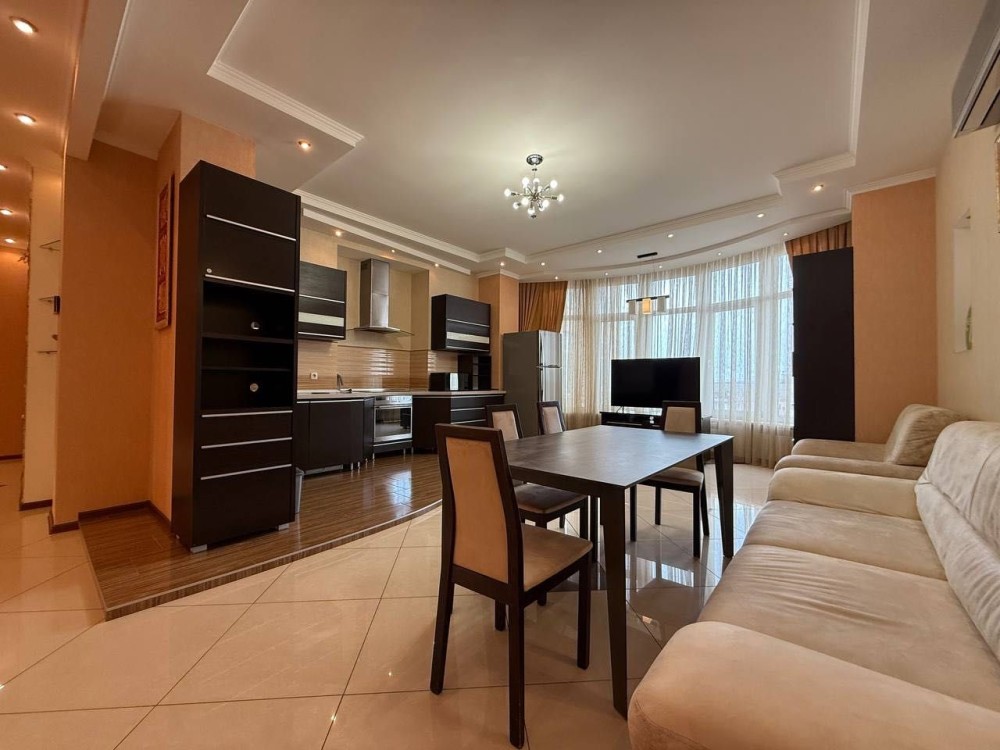 Квартира з євроремонтом, укомплектована всіма меблями та технікою: холодильник, 3 кондиціонери, ел. плита, ел. духовка, мікрохвильова піч, витяжка, ел. чайник, посудомийка, 2 телевізори, 2 бойлери, пральна машина. Є балкон – засклений. 2 санвузли, тепла підлога в коридорі та санвузлах від опалення.