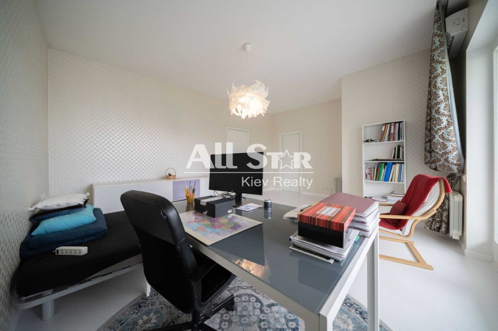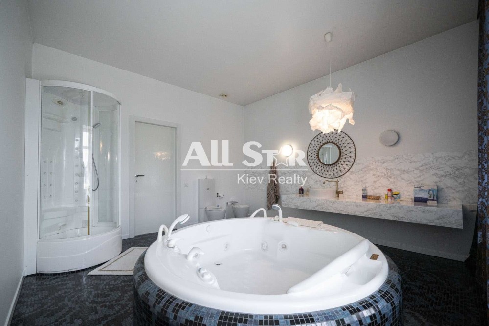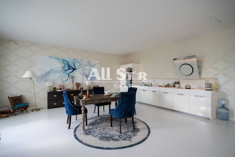 На першому поверсі: кухня-студія 100 кв. м., гостьовий санвузол, гостьова спальня, гардеробна, засклений балкон.