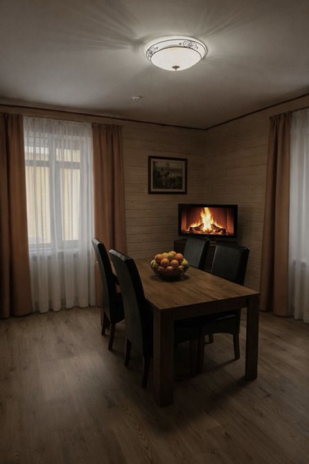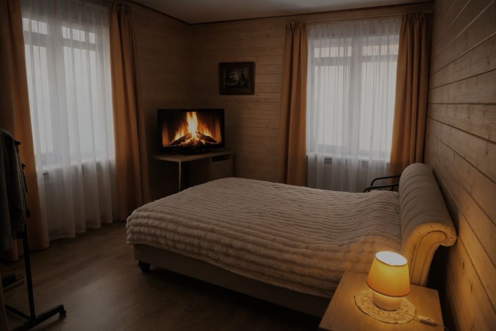 Ціна від 10000 грн. До 7 гостей -10000 грн за добу. Лазня та басейн оплачується окремо 5000 грн за добу або погодинно -1000 грн за годину.(Мінімум 4 години). Доплата за кожного наступного гостя 1000 грн. П’ятниця ,субота та неділя вартість оренди на 1000 грн вище. 332 Будинок-зруб з басейном з підігрівом та лазнею. 3 великі спальні, розрахований лише до 12 гостей, за стіл можна розмістити до 12 гостей та спальних місць 9. Приймаються тільки не гучні компанії. На території є альтанка з зоною барбекю, мангал, тенісний стіл. На першому поверсі: зал-студія, басейн з підігрівом та лазня. На другому поверсі 3 роздільні, просторі спальні. Лазня, басейн та квадроцикл оплачується окремо. Також можлива оренда без лазні та басейну. Будинок повністю обладнаний для комфортного проживання, є всі необхідні меблі та побутова техніка, є стіл на 8 персон та камін.