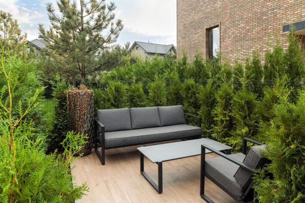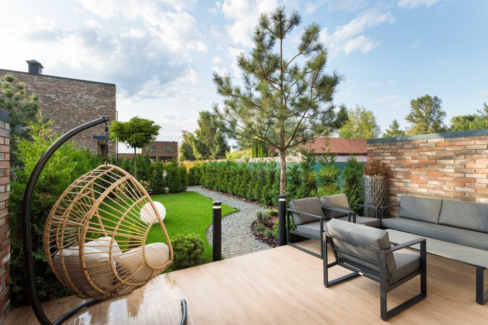 Задній двір з ландшафтним дизайном облаштований системою автоматичного поливу, двома терасами, автоматичною маркізою, зоною барбекю.