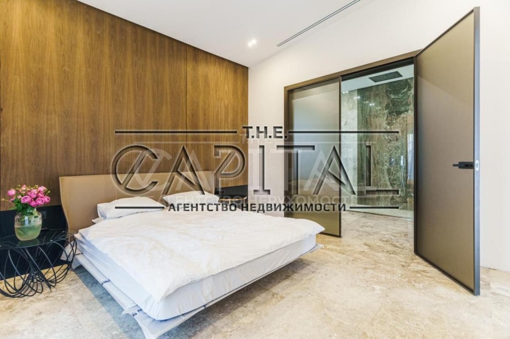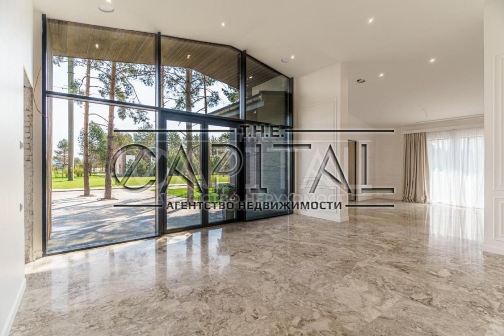 В доме просторный холл, панорамные окна, две гардеробные, 5 санузлов, кухня отделена от столовой-гостиной раздвижными системами, гостевой санузел, четыре спальни с собственным санузлом, комната свободного назначения с выходом на просторную террасу.