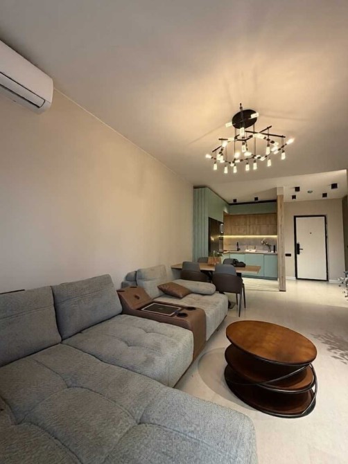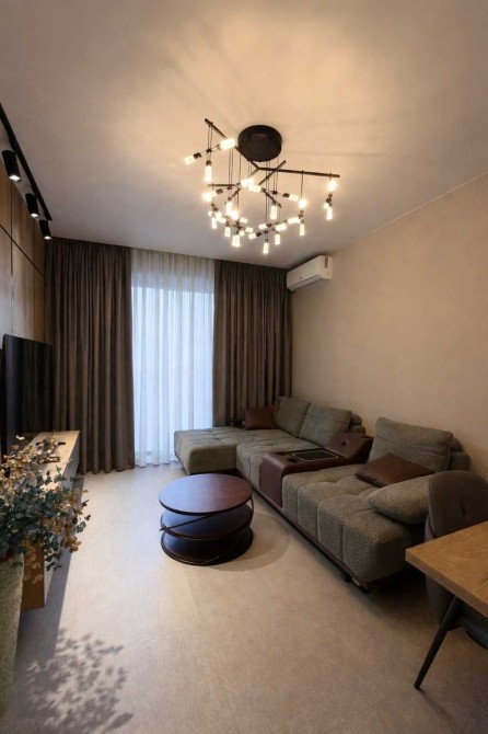 Оренда двокімнатної квартири в житловому комплексі закритого типу. Простора та світла вітальня з панорамними вікнами, сучасним кутовим диваном і стильним освітленням. Інтер’єр виконаний у сучасному мінімалістичному стилі з поєднанням теплих та натуральних відтінків, що створює атмосферу затишку та комфорту.