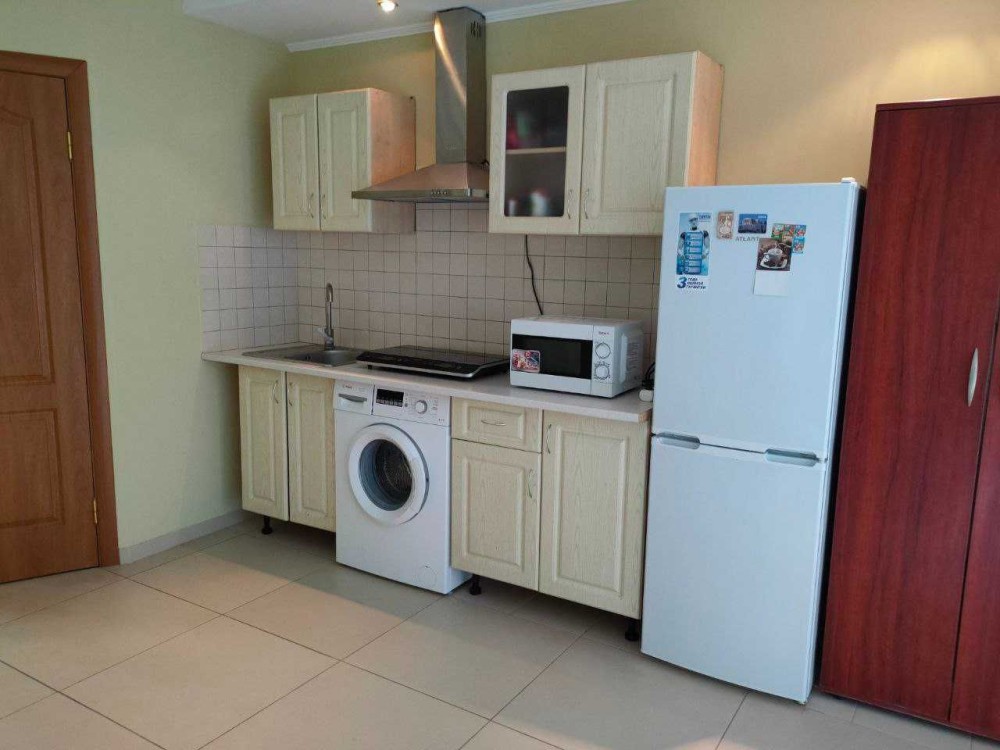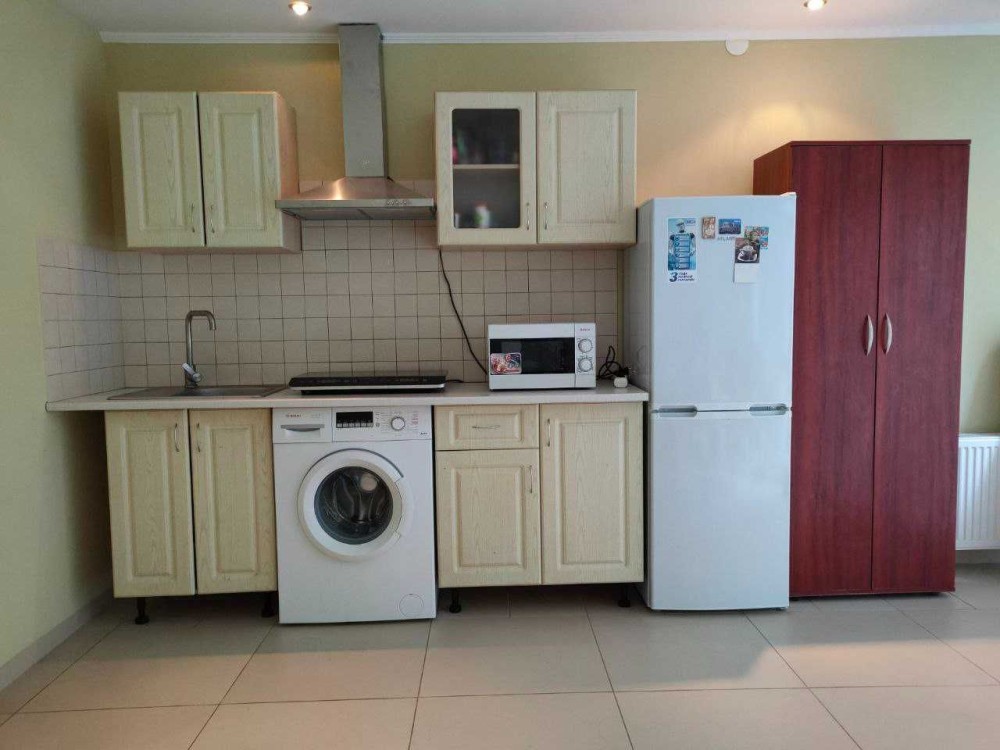 На 1 поверсі - санвузол і кухня-студія. Побутова техніка-холодильник,пральна машина, мікрохвильова пічка,чайник та індукційна пічка на 2 комфорки, праска та прасувальна дошка.