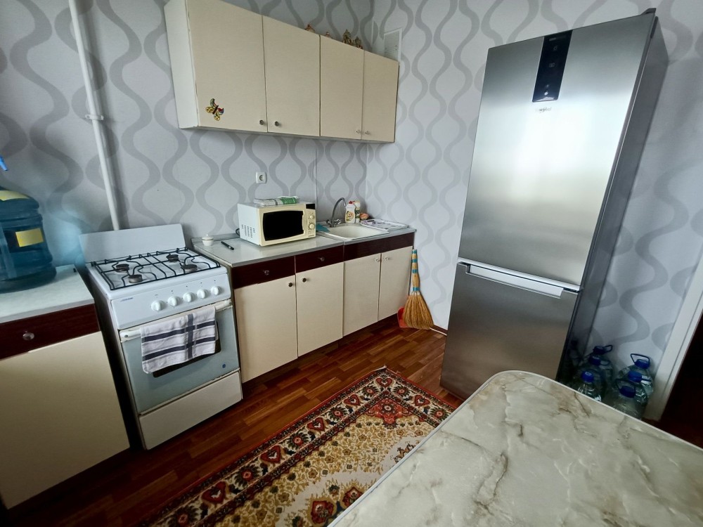 Є кухня, диван, пральна машинка, мікрохвильовка, холодильник.
