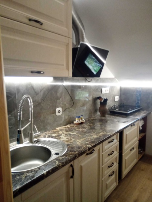 кухня (холодильник з мороз.камерою, піч індукційна, духова шафа, каструлі, витяжка, мийка, мікрохвильовка, посудомийка, посуд),