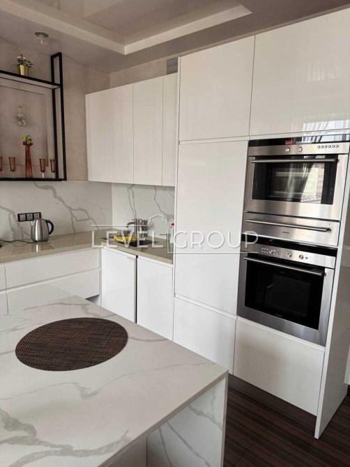 Кухонна зона виконана у сучасному стилі: білі глянцеві фасади, стільниці з імітацією мармуру (включно з кухонним островом/барною стійкою). Кухня повністю обладнана вбудованою технікою (духова шафа, мікрохвильова піч, варильна поверхня, витяжка, холодильник).