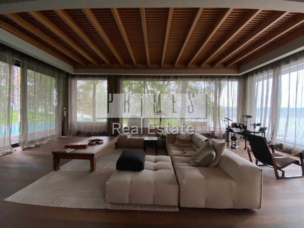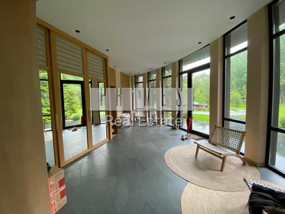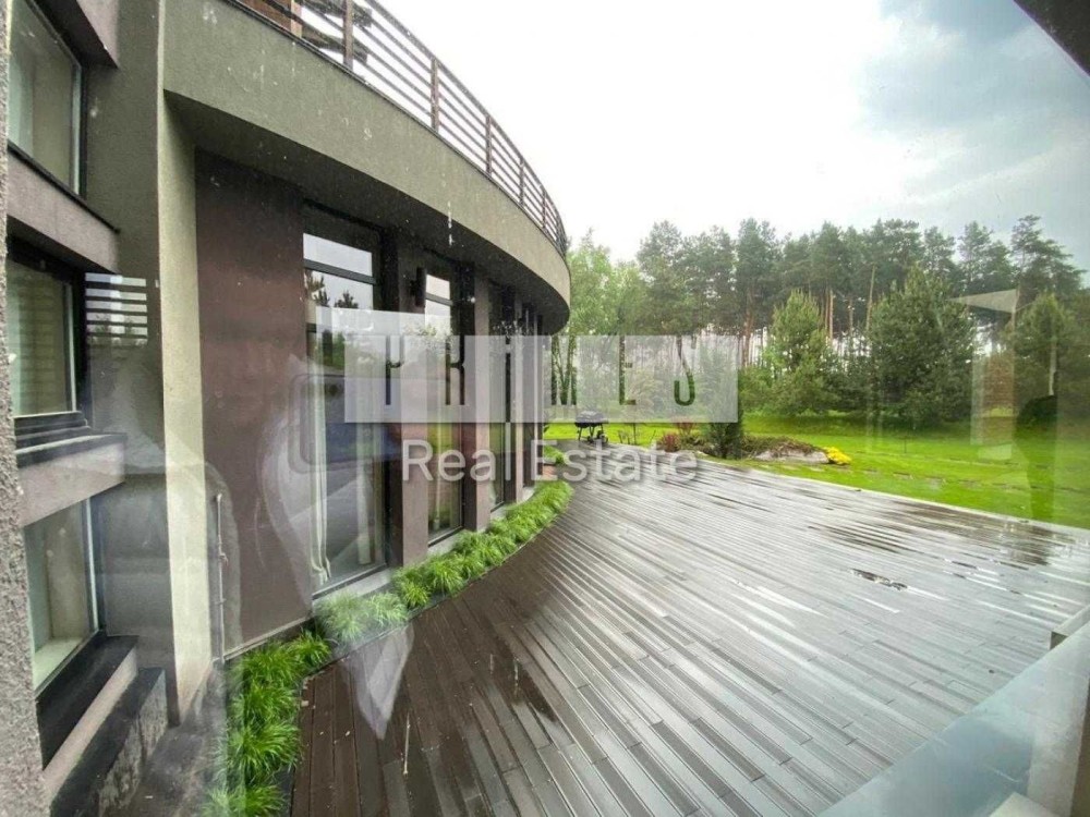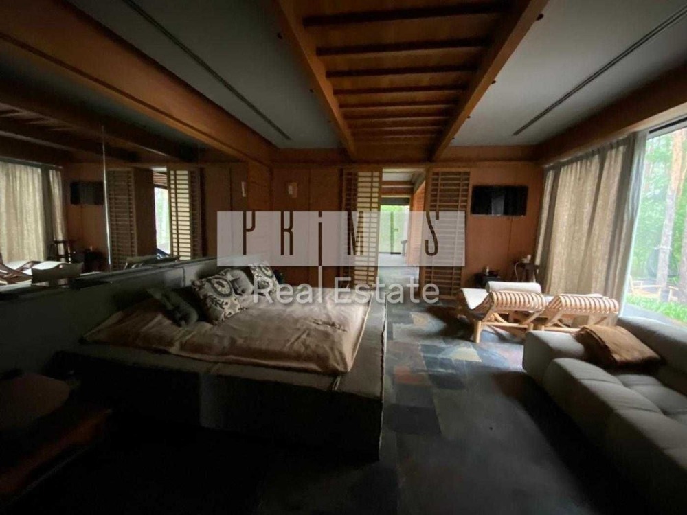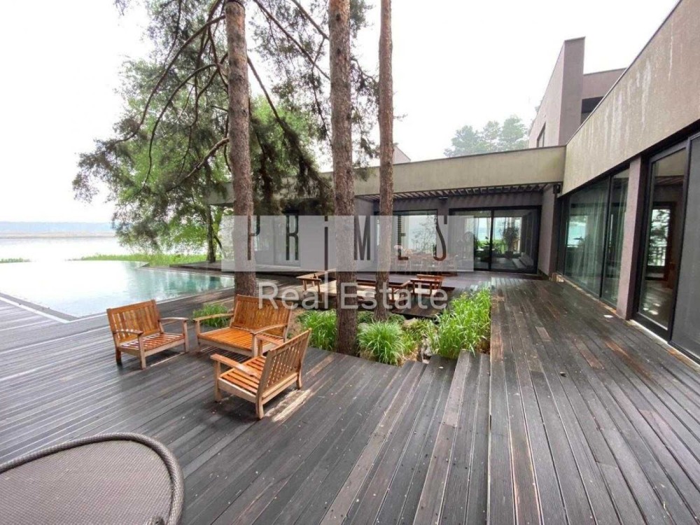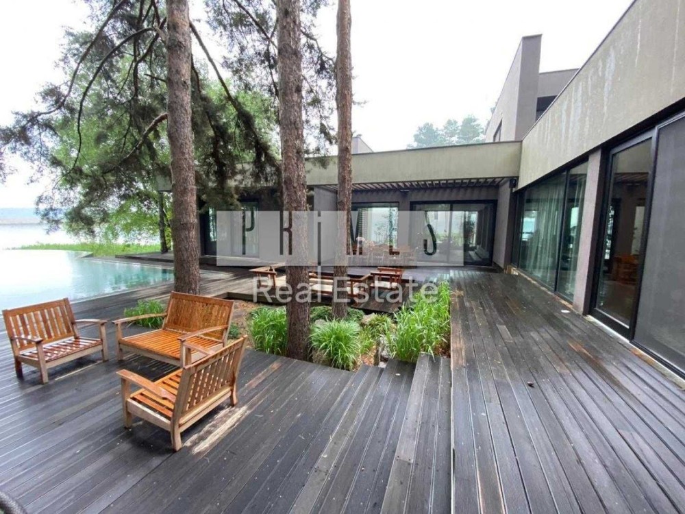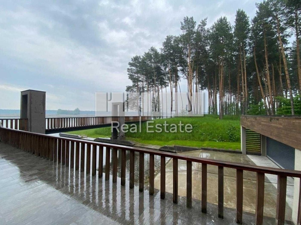 Пропонується в оренду унікальний двоповерховий будинок категорії «Deluxe» загальною площею 1030 м², розташований на закритій охоронюваній території. Це резиденція, з високоякісними матеріалами та сучасними інженерними системами. Архітектура будинку нетипова для української заміської нерухомості — зі світлими відкритими просторами, панорамними вікнами, другим світлом, скляними стінами та спеціально виготовленими великоформатними світловими елементами. Будинок розташований у сосновому лісі, на материковому березі давньої річки Стугна.