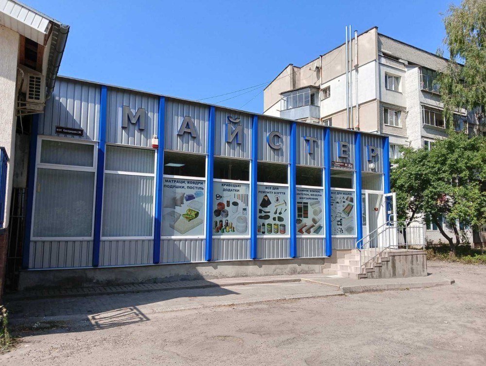 Будівля одноповерхова . Великі фасадні скляні вітрини .