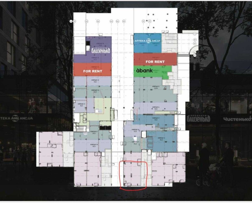 Приміщення кутове, має вигідне розташування. Виходить на сквер, також гарно проглядається з сусідніх будинків. А також виходить в арку, через яку буде відбуватись транзит відвідувачів шоппінг центру.