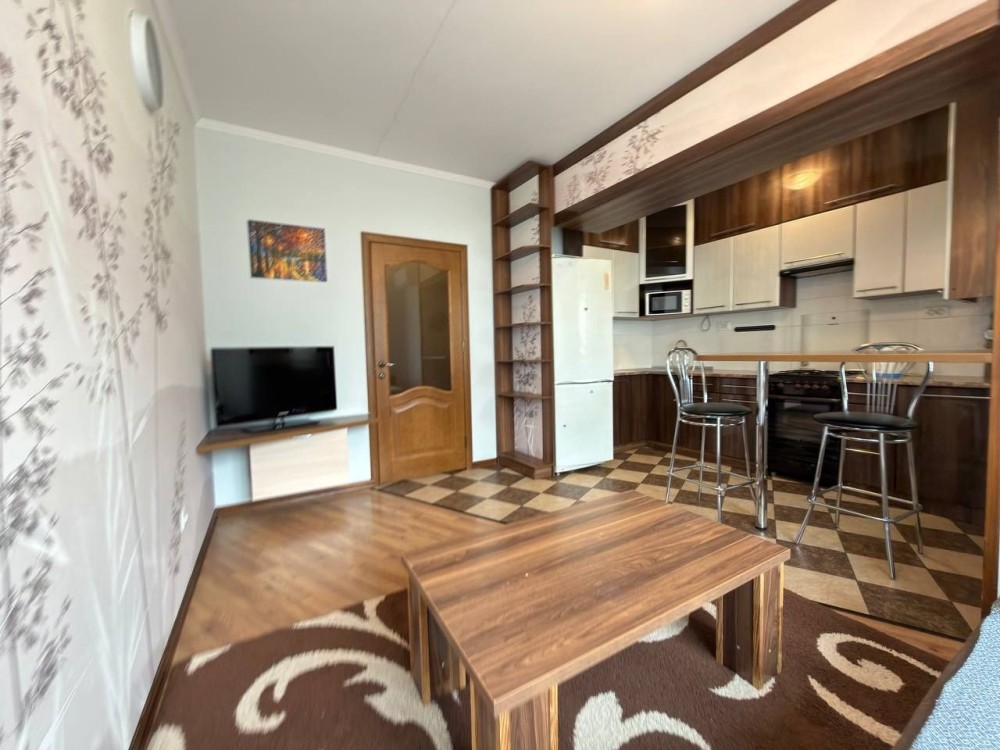 Кухня-студія виконана у світлих, приємних тонах і повністю укомплектована всією необхідною технікою та посудом: є духовка, мікрохвильова піч, електрочайник. Простір доповнює зручний розкладний диван, телевізор, кондиціонер, обідній столик для гостей, а також встановлено підігрів підлоги, що додає комфорту в холодну пору року.