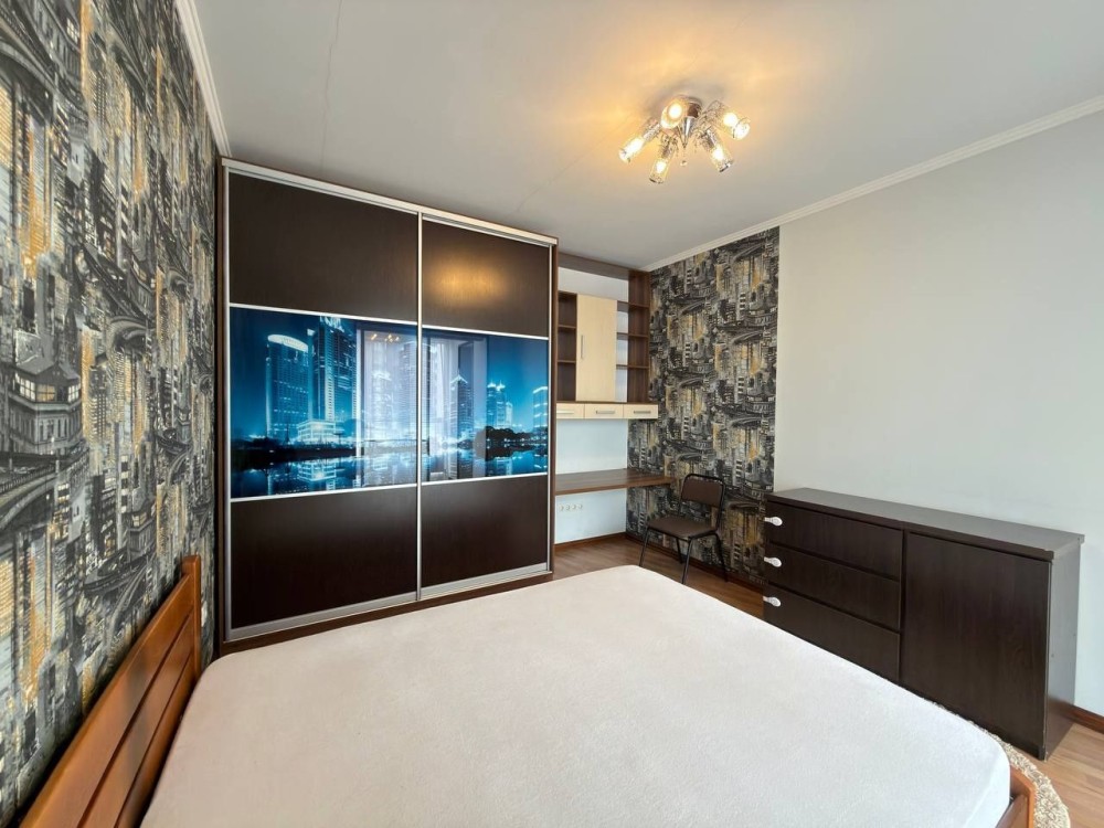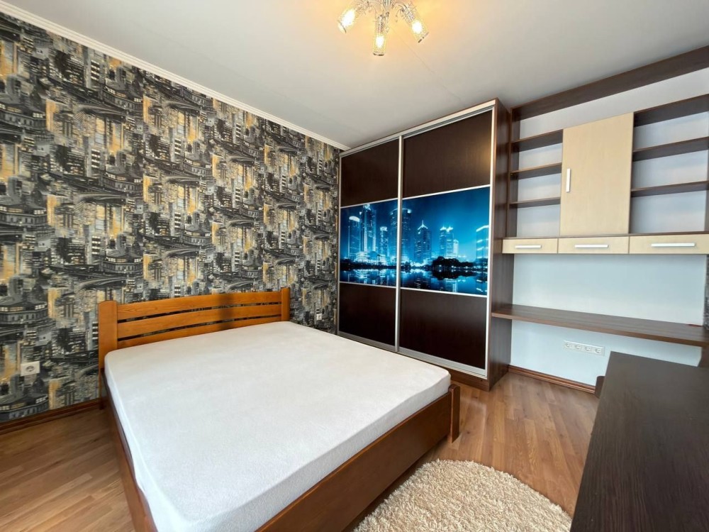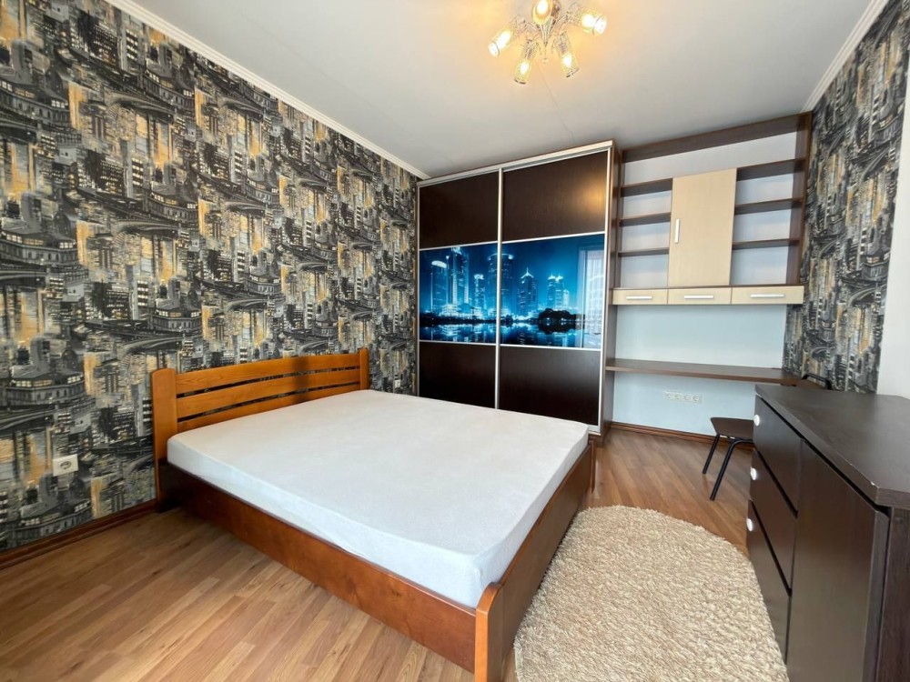Окрема спальня створює атмосферу затишку та відпочинку: тут розташоване двоспальне ліжко, містка шафа-купе, комод і робочий стіл — чудове рішення як для сну, так і для роботи з дому.
