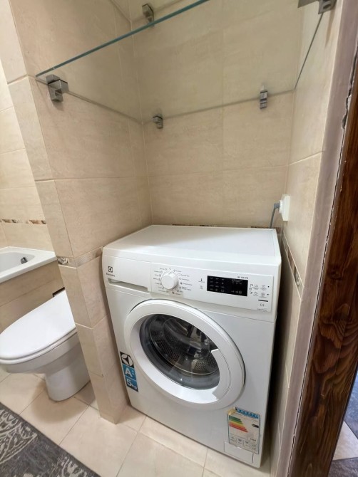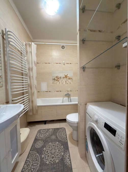 Планування продумане до дрібниць. При вході — затишний коридор із великою шафою-купе для зручного зберігання речей. Ванна кімната обладнана всім необхідним: є ванна, санвузол, умивальник, дзеркало, пральна машина, а також додаткові полиці для побутової хімії та косметики.