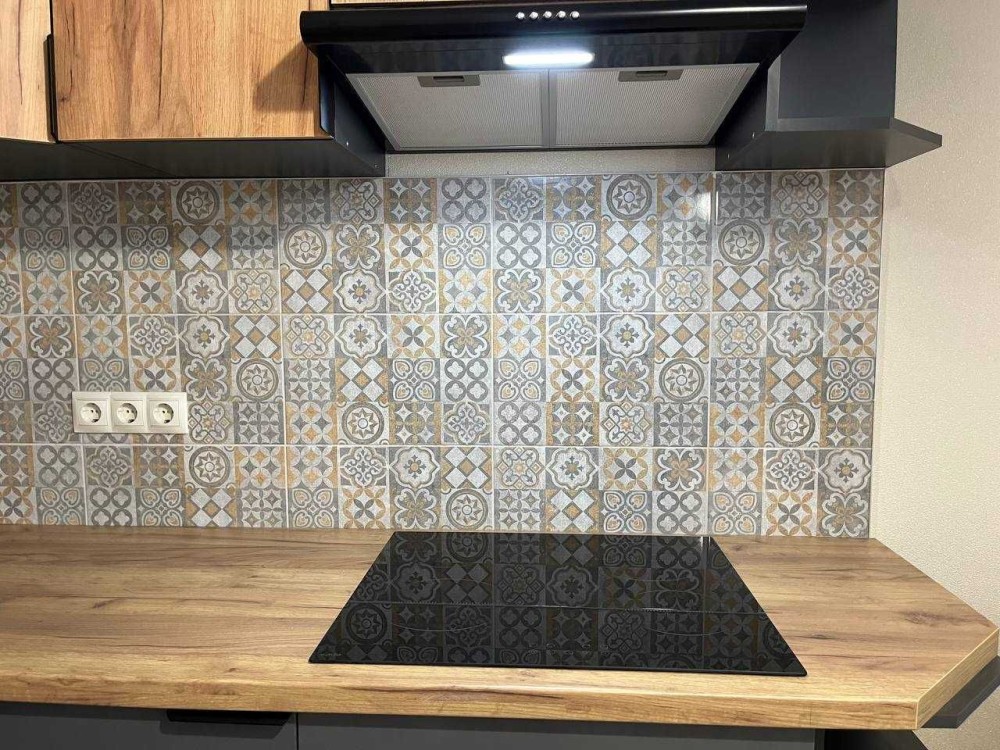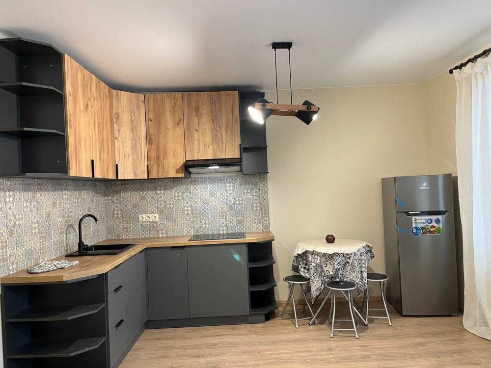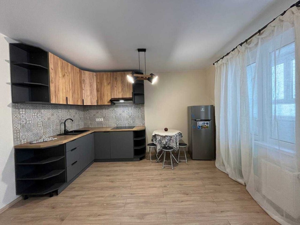 * Вбудована кухня, варильна поверхня, холодильник, витяжка, стіл, стільці.